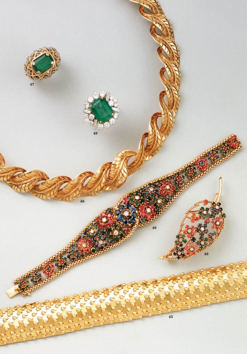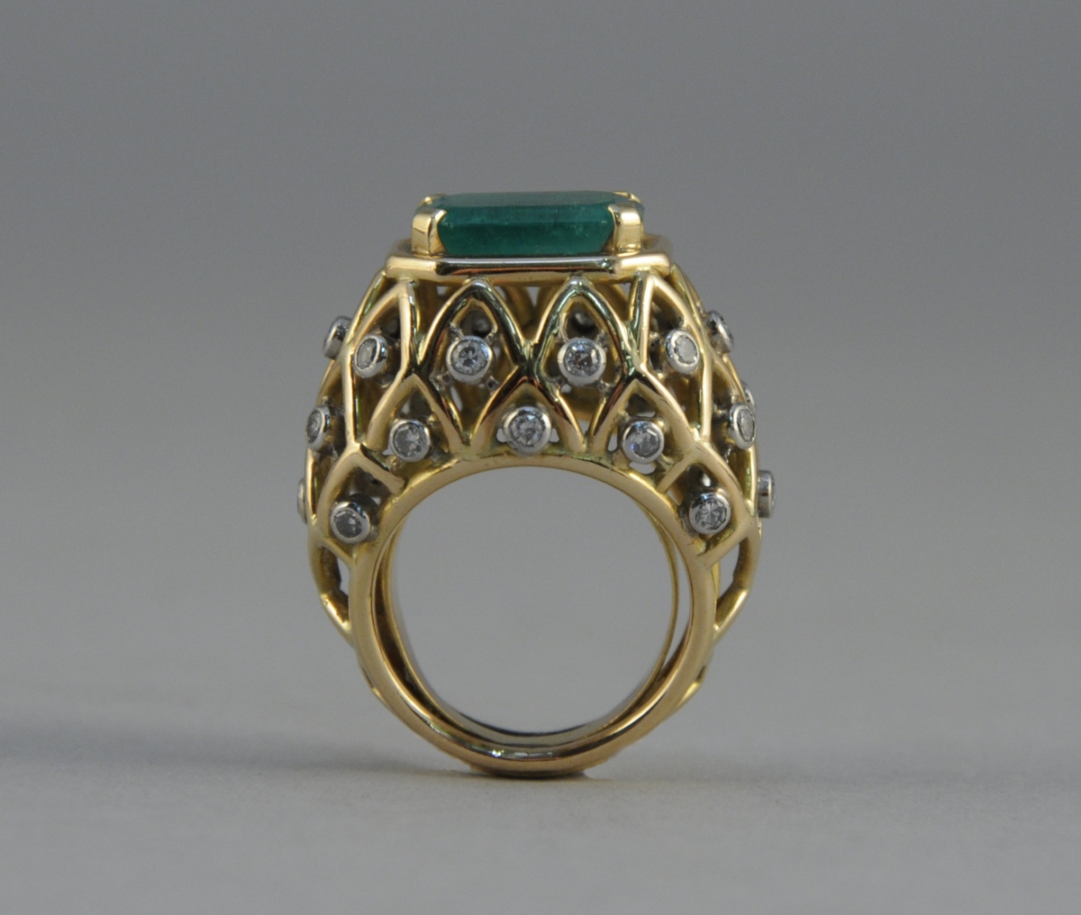 BAGUE boule en platine et or jaune ajouré à décor géométrique, partiellement sertie de petits diamants, ornée au centre d'une émeraude rectangulaire à pans coupés d'environ 3 / 3,50 carats.