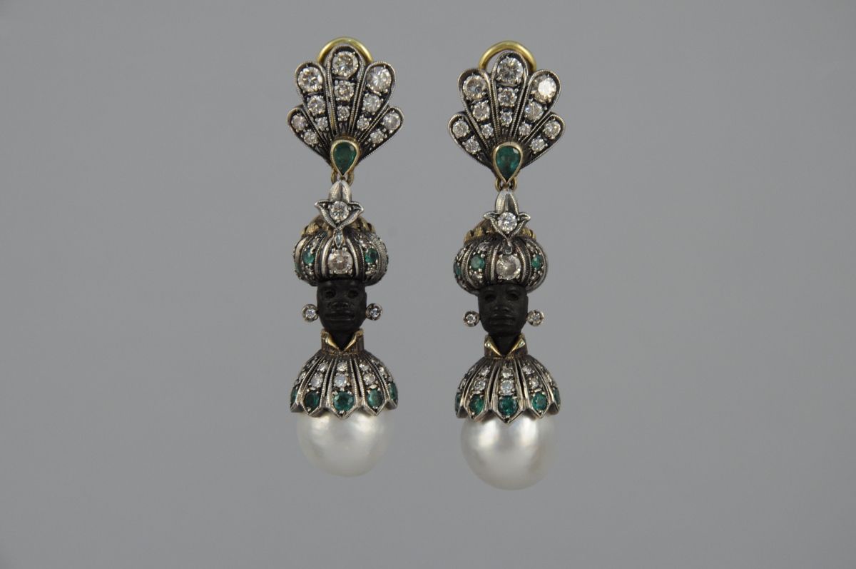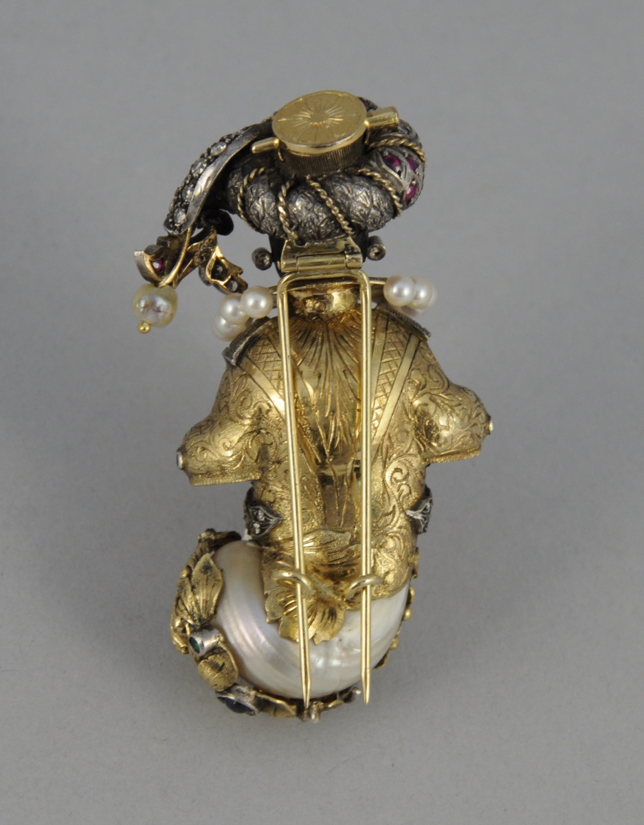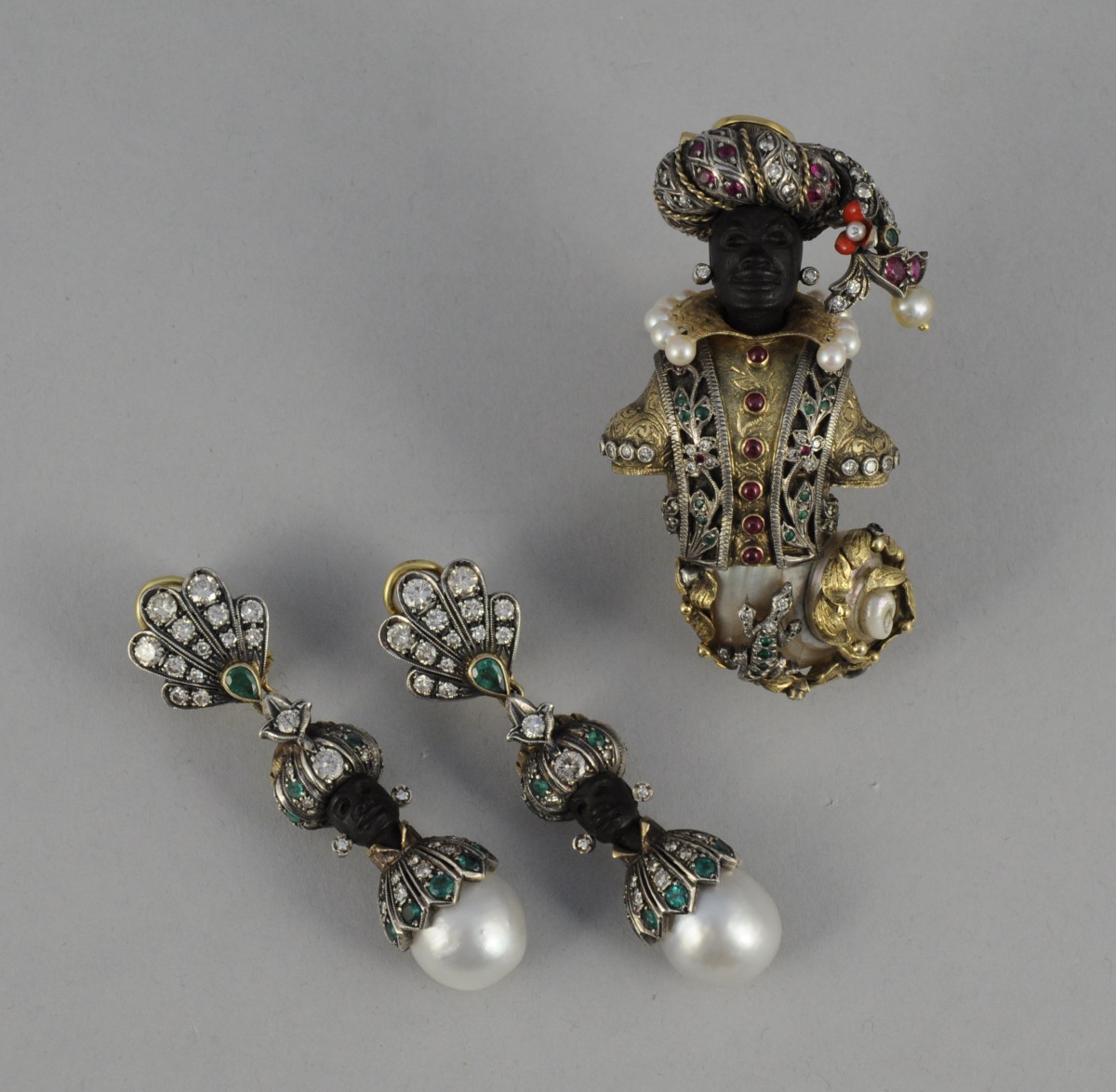 BROCHE et PAIRE DE PENDANTS D'OREILLES à décor de "maure" en or et argent ornés de perles
