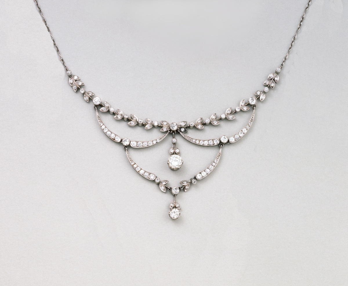 COLLIER DRAPERIE en or gris serti de diamants ronds, certains taillés en 8/8.