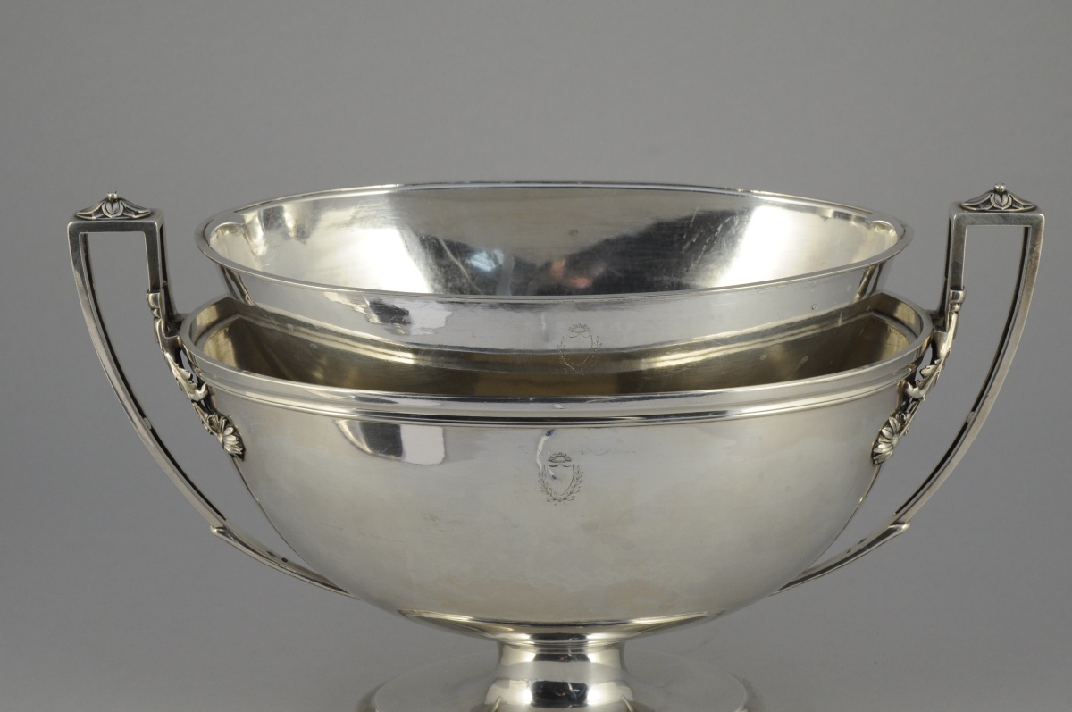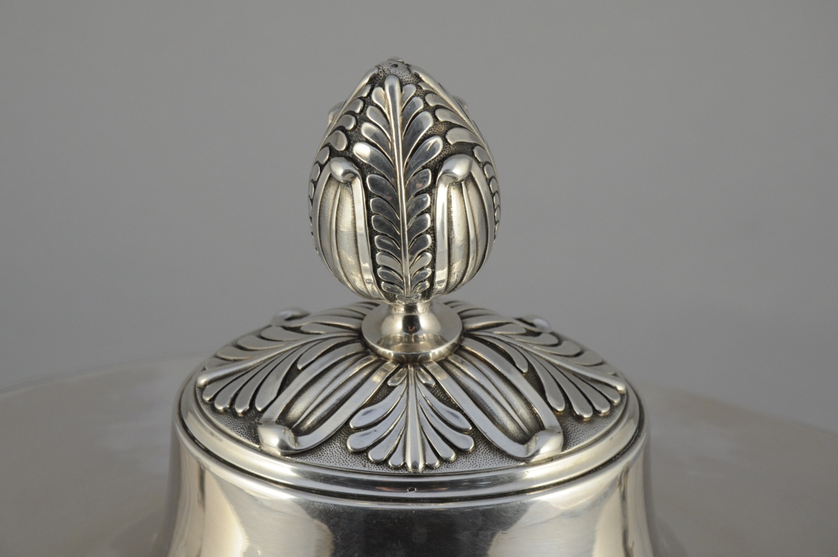 oblongue et sa doublure, sur piédouche en argent uni à décor au filet. Les anses ajourées à décor appliqué d'acanthes et fleurettes. Le couvercle à doucine sommé d'une graine à décor de palmettes et fleurs de pavot.