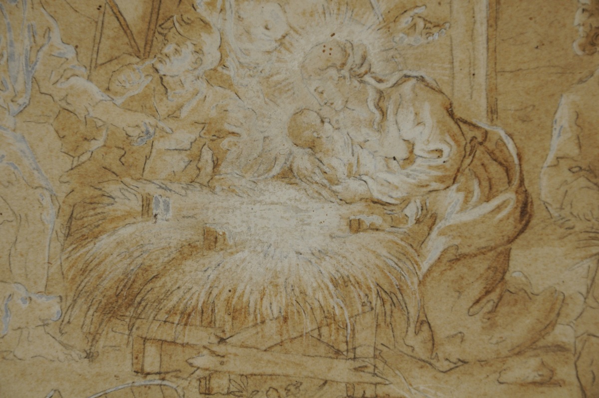 Plume et encre brune, lavis brun et rehauts de blanc sur traits à la pierre noire.