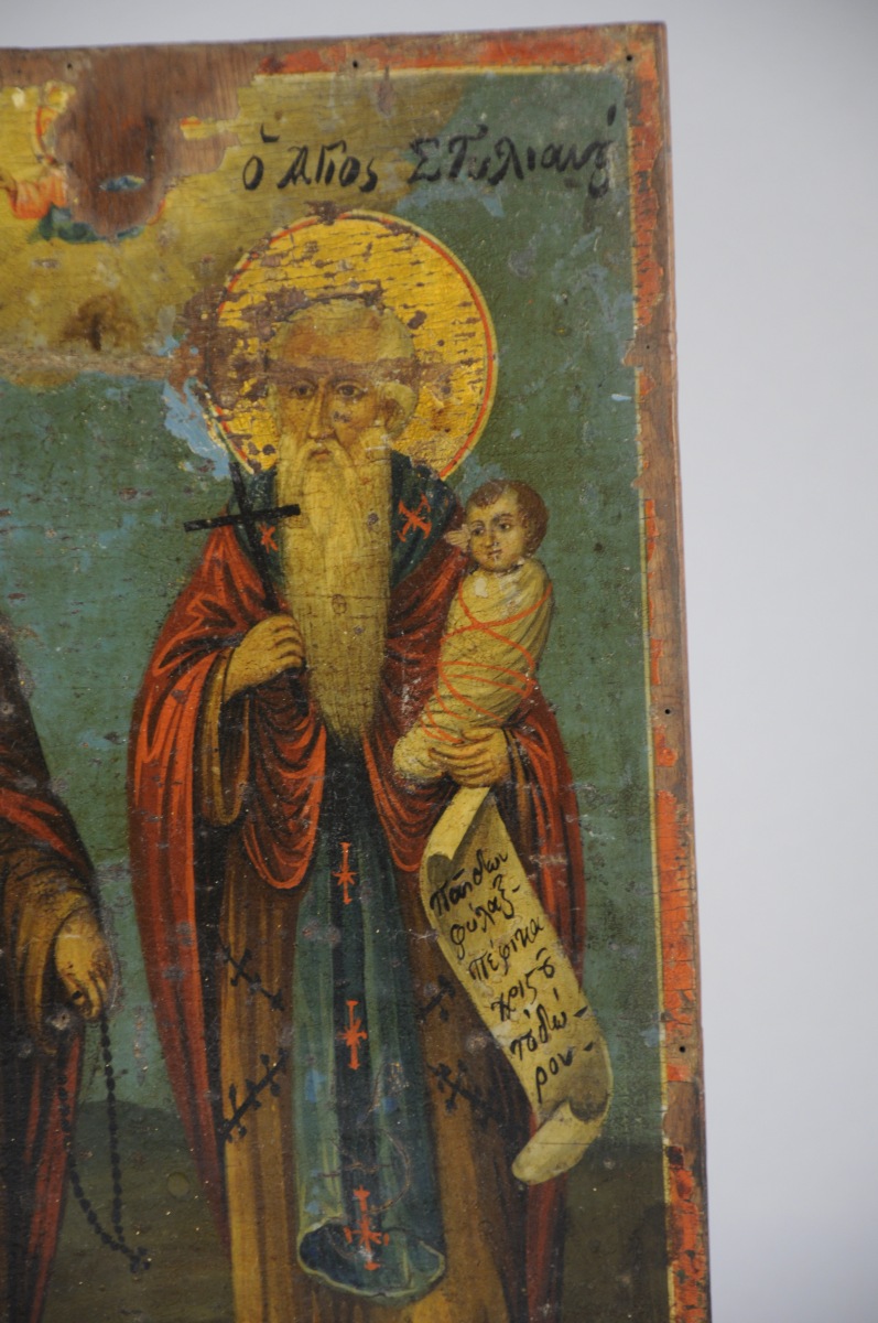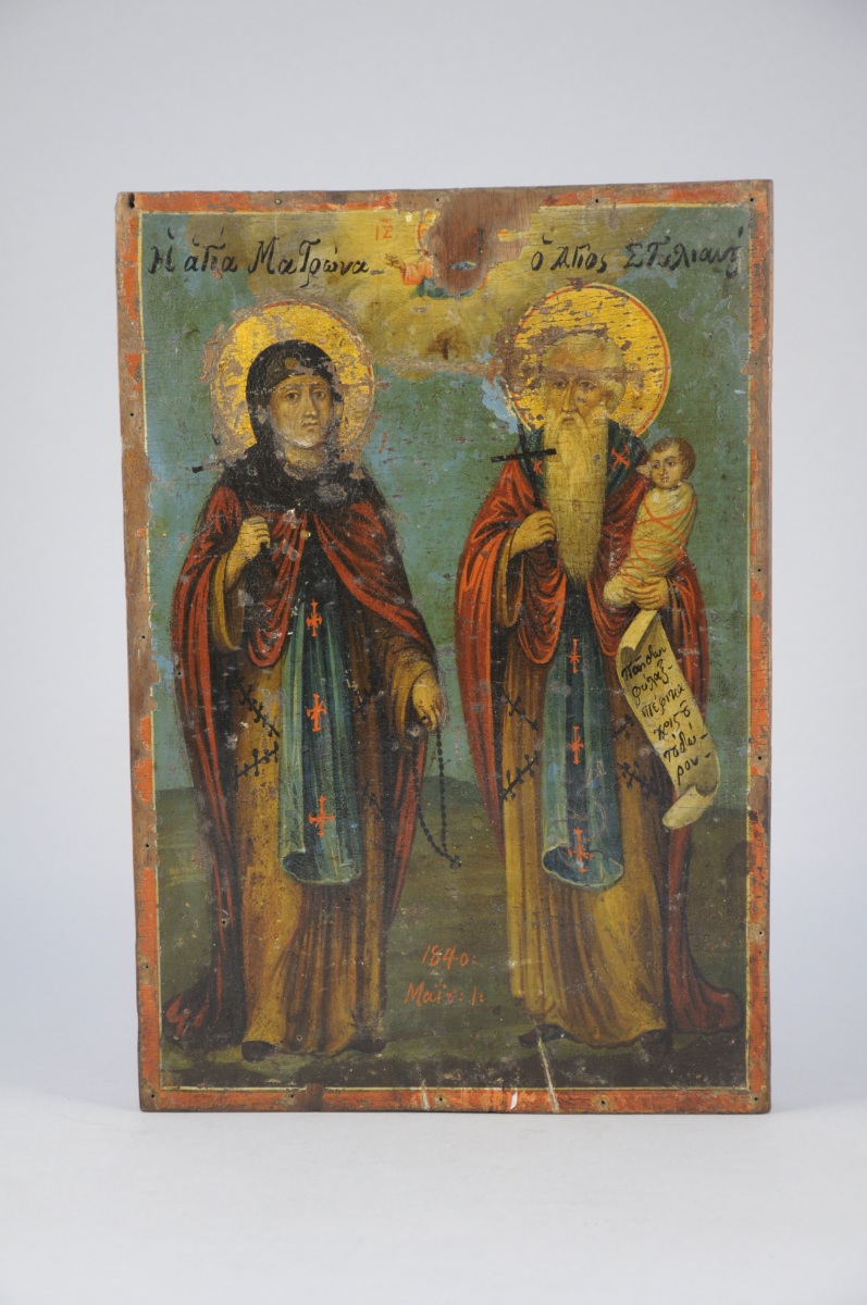 SAINT ET SAINTE.Icône.Art Grec, XIXe (datée 1840).40 x 27,5 cm.(Usures...
