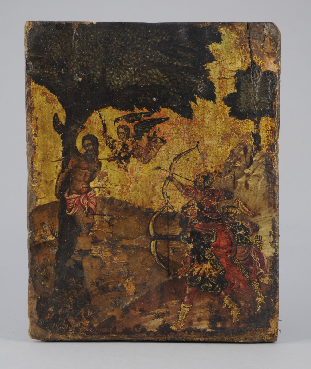 LE MARTYR DE SAINT-SÉBASTIEN.Icône à fond d'or.Art grec, XVIIIe.27,5 x...