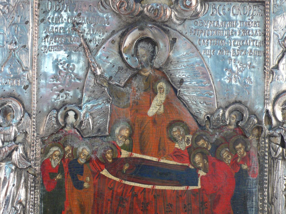 Icône au riza en métal argenté. La Vierge, couchée, voit son âme s'envoler sous la forme d'un enfant emmailloté. Dans les marges, un Saint et une Sainte. Au sommet dans un nuage, le Dieu Sabboath bénissant.
