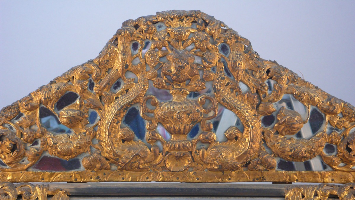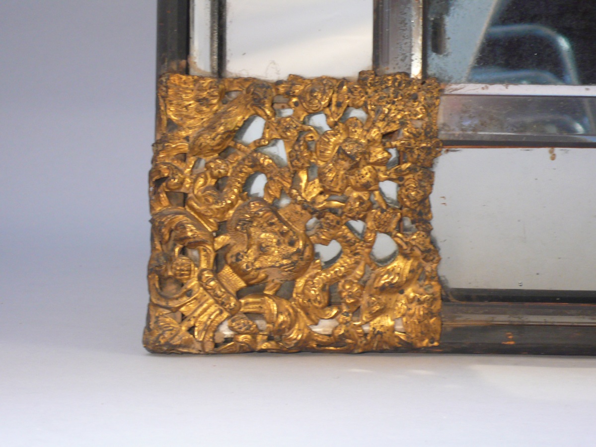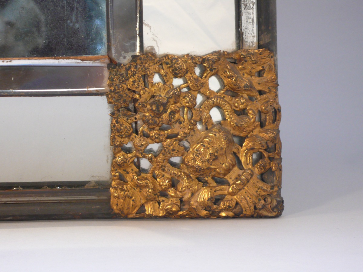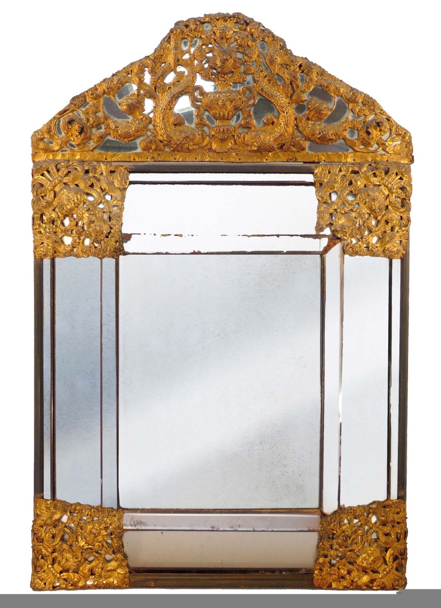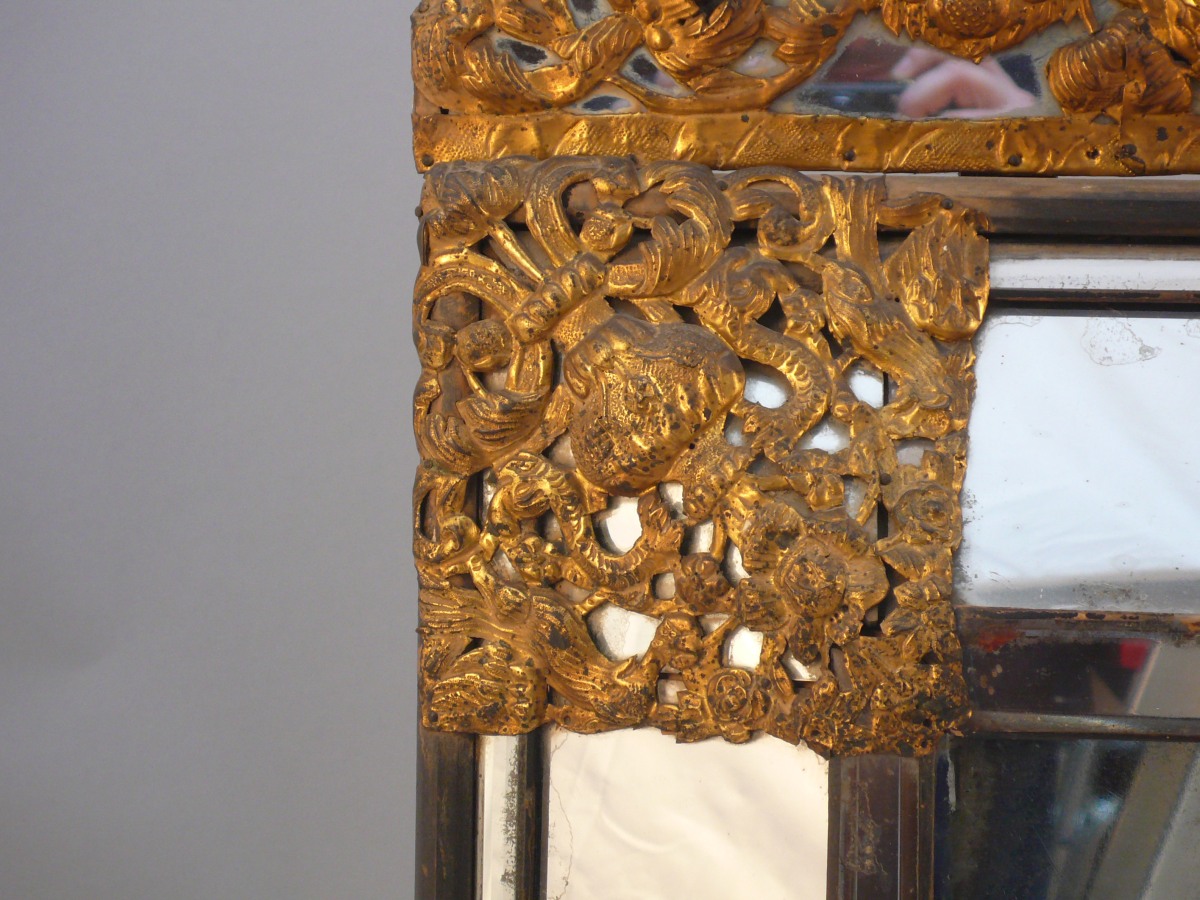 rectangulaire à pans coupés en glace biseautée et laiton doré repoussé. Les écoinçons et le fronton à décor ajouré de vases fleuris flanqués de dauphins affrontés, d'oiseaux sur des branchages en volutes et de guirlandes de fleurs.