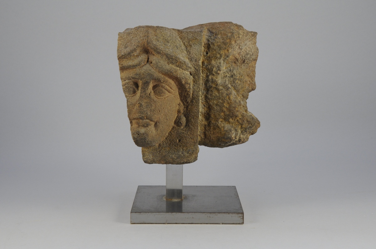 à entablement en granit volcanique. Sculpté en façade d'une tête d'homme portant la barbe et, à chacun de ses côtés, d'une tête féminine.