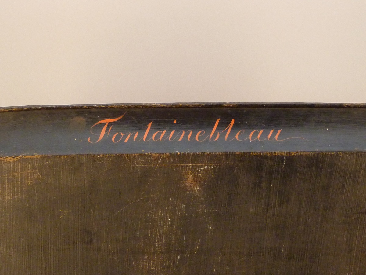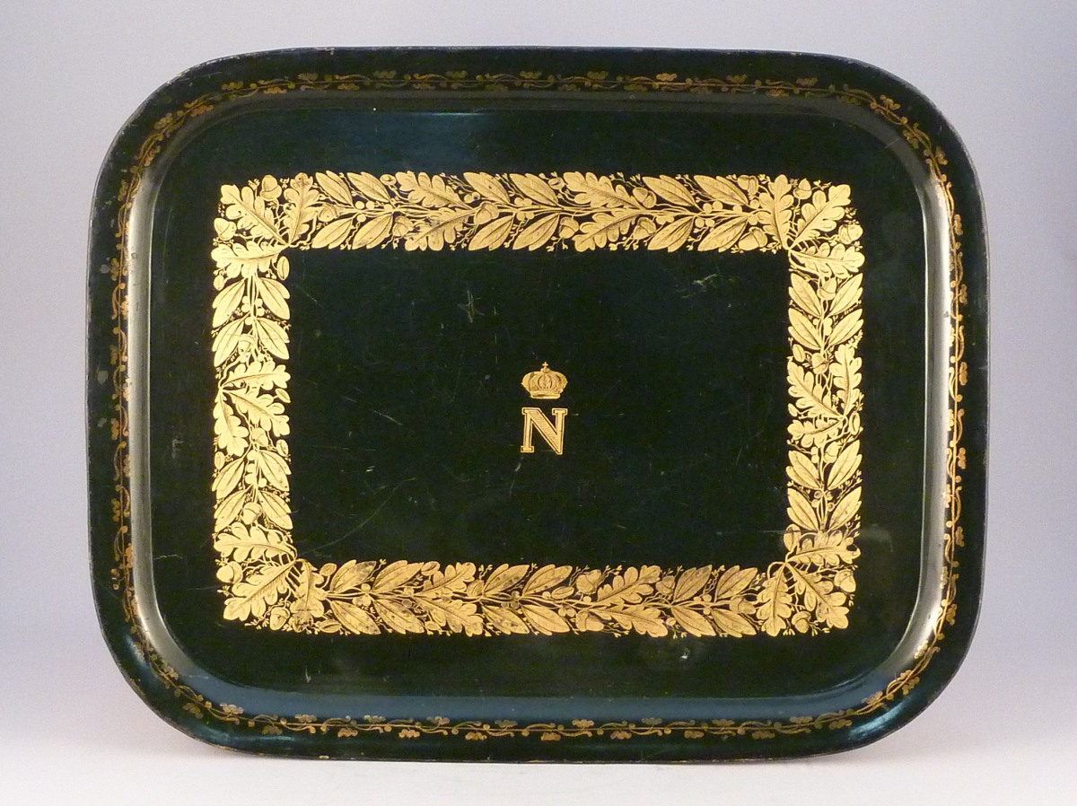 rectangulaire en tôle laquée vert à décor or d'une frise de feuilles de chêne et de lauriers, centré du "N" sous couronne fermée. Marque peinte en rouge au dos "Fontainebleau".