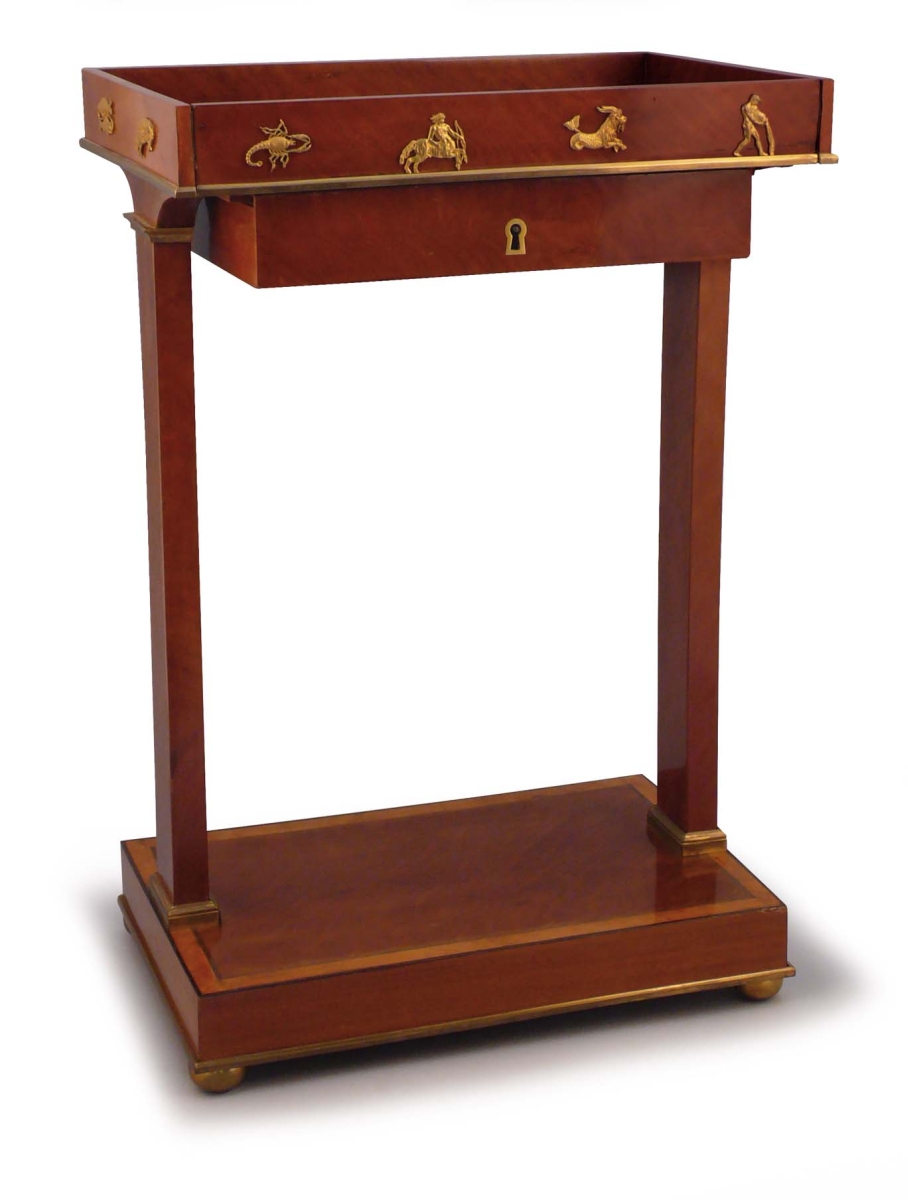 en acajou et placage d'acajou blond, et baguettes de bronze. Elle ouvre par un tiroir et repose sur deux montants terminés par une base carrée. Les pieds en boules aplaties. Décor d'ornementations de bronze doré à décor des douze signes du Zodiaque sur la bordure du plateau.