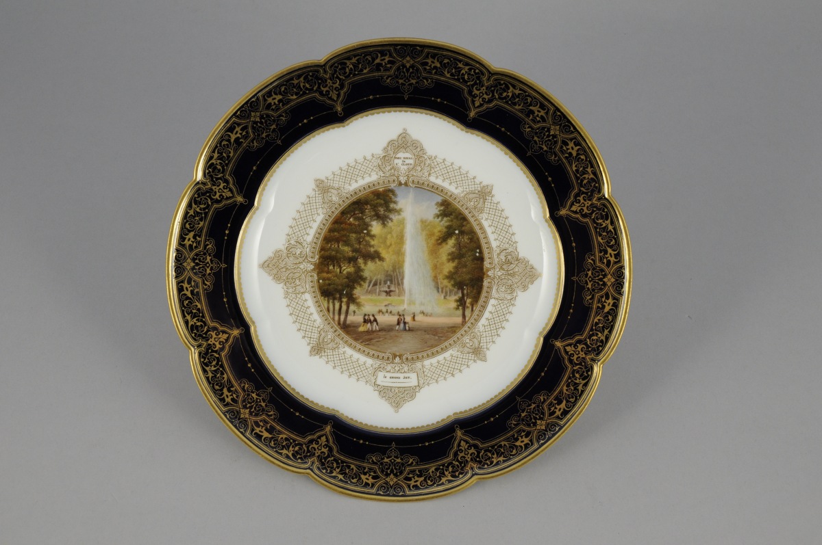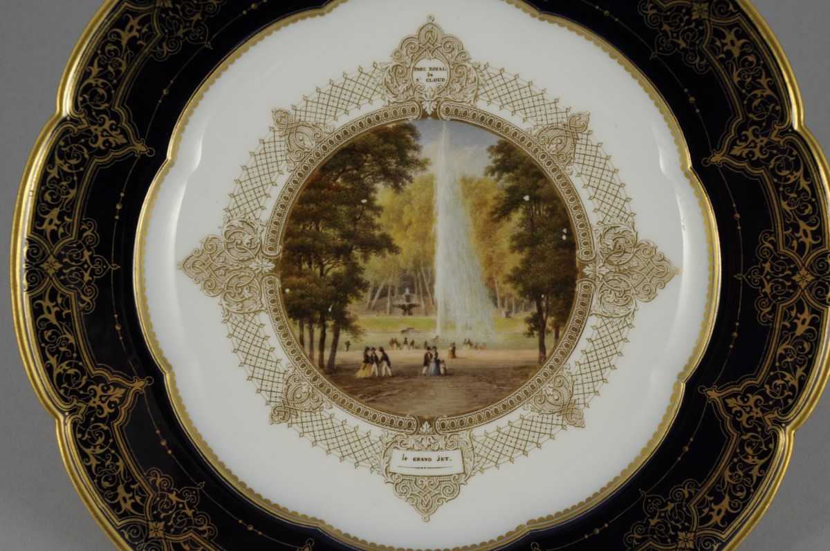 en porcelaine, l'aile polylobée à fond bleu doré de rinceaux de feuilles. Le bassin à décor peint de vues des parcs royaux de Saint-Cloud et Fontainebleau dans des encadrements dorés d'oves et d'entrelacs.