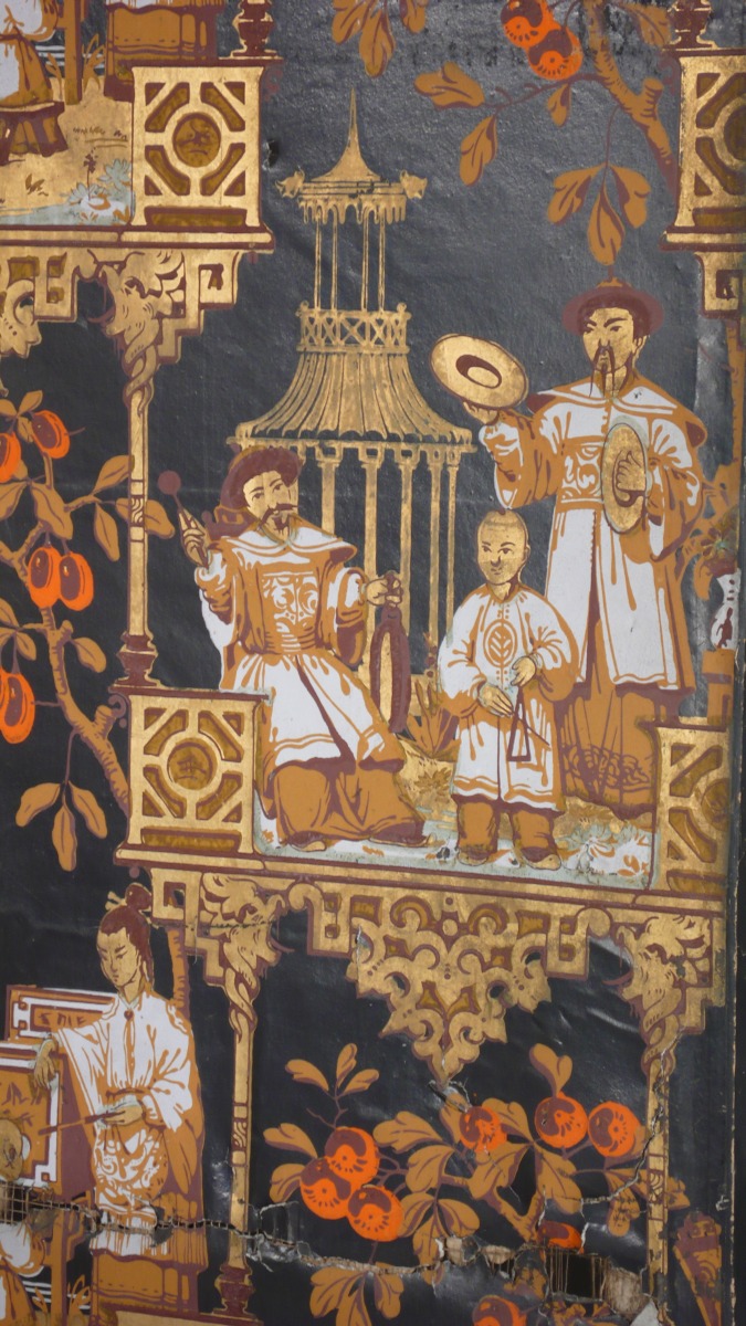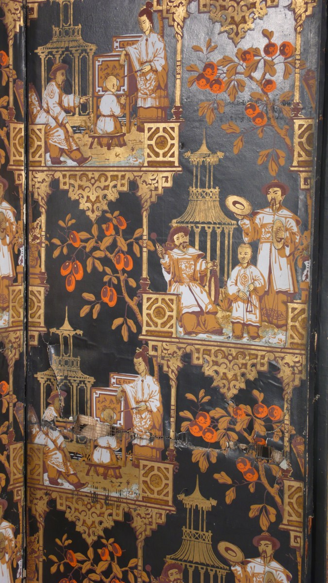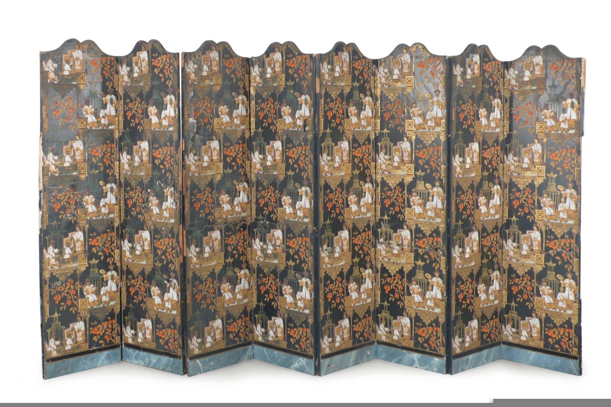 à huit feuilles en papier peint à la planche et doré marouflé sur toile à décor aux Chinois de cours de musique et calligraphie sur fond d'architectures et d'arbres fruitiers. Partie basse à imitation d'une