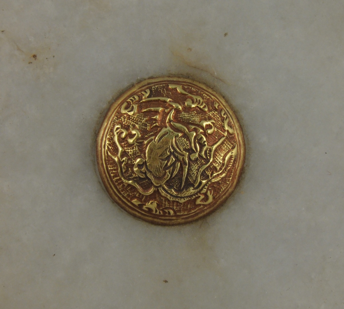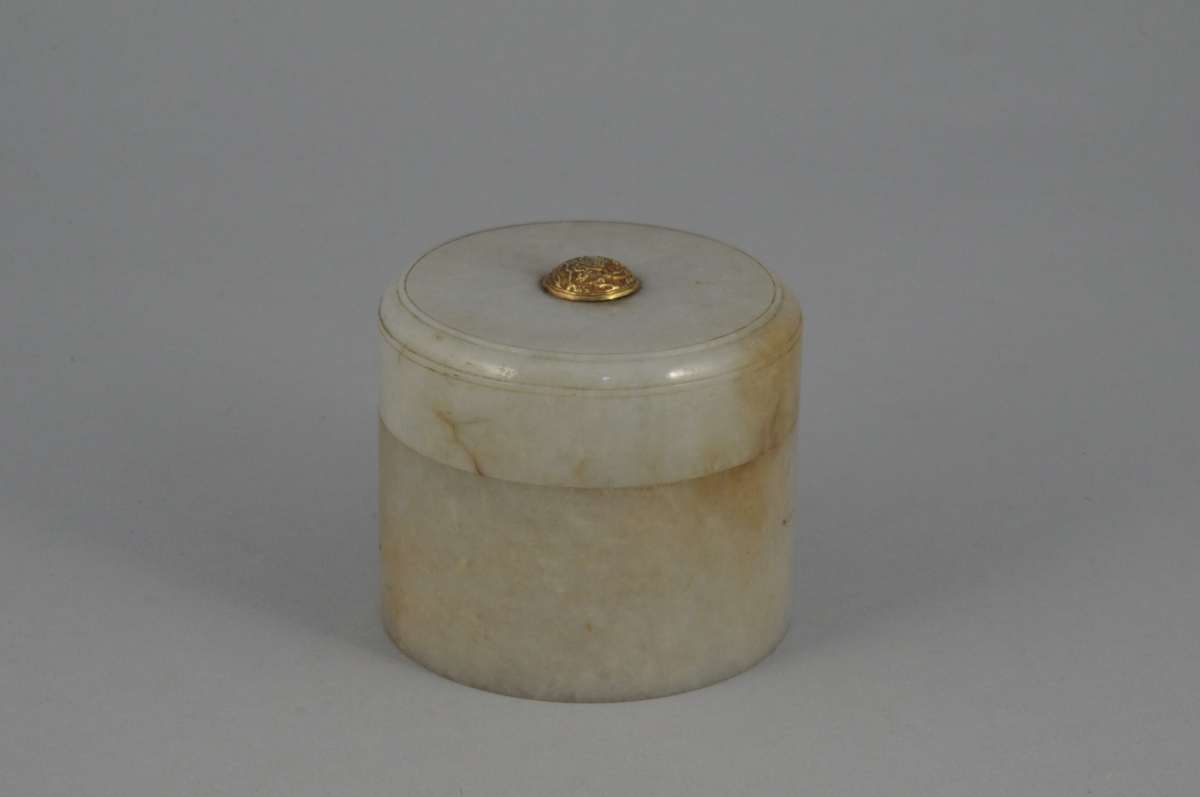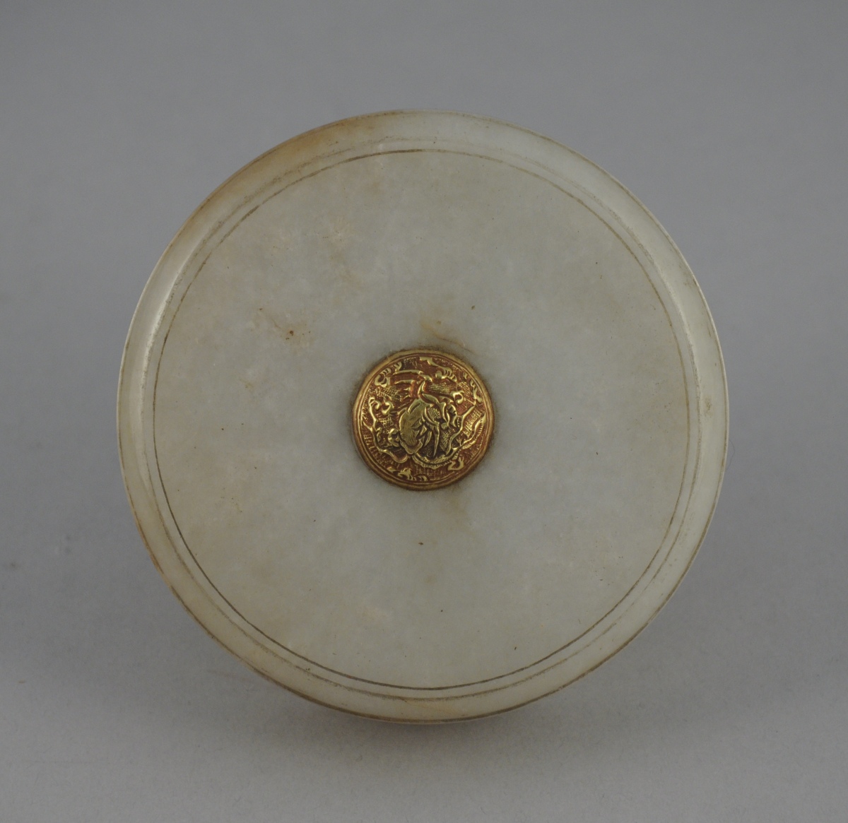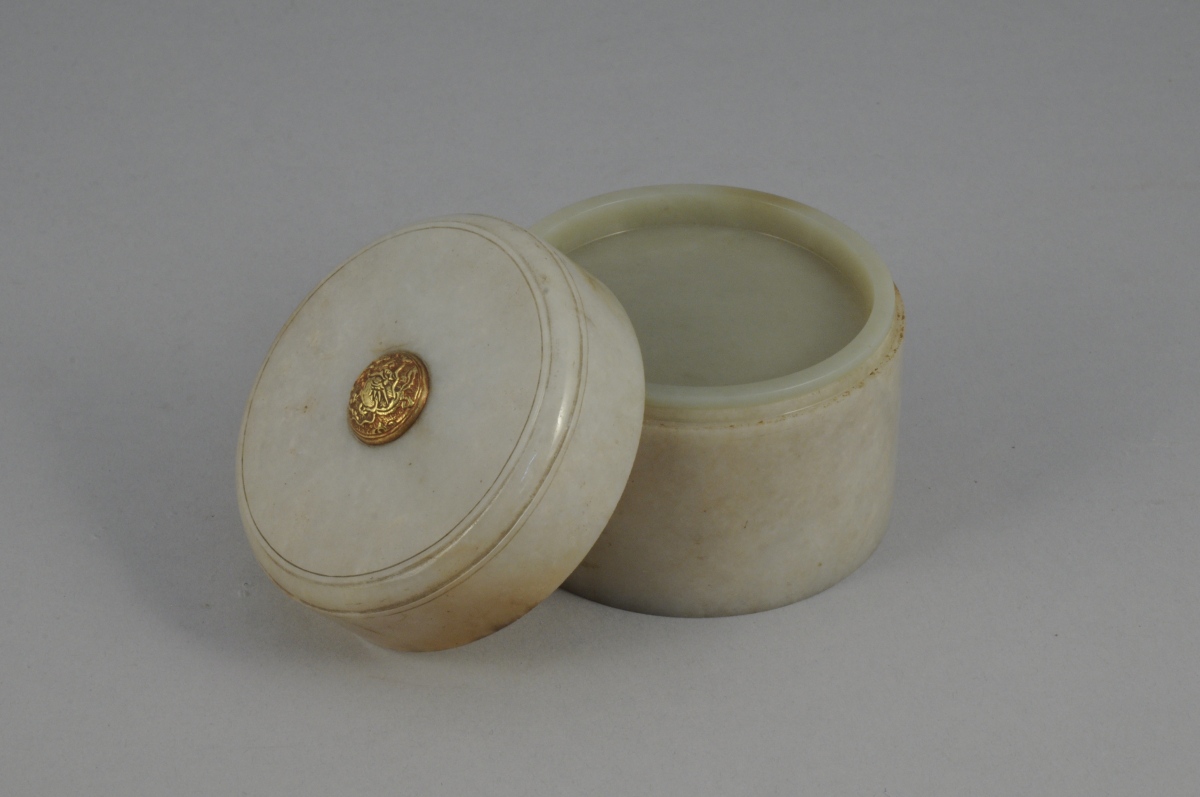 de forme cylindrique, avec plateau intérieur en néphrite céladon clair taché de brun rouille. Le couvercle orné d'un médaillon de dragon en cuivre doré.