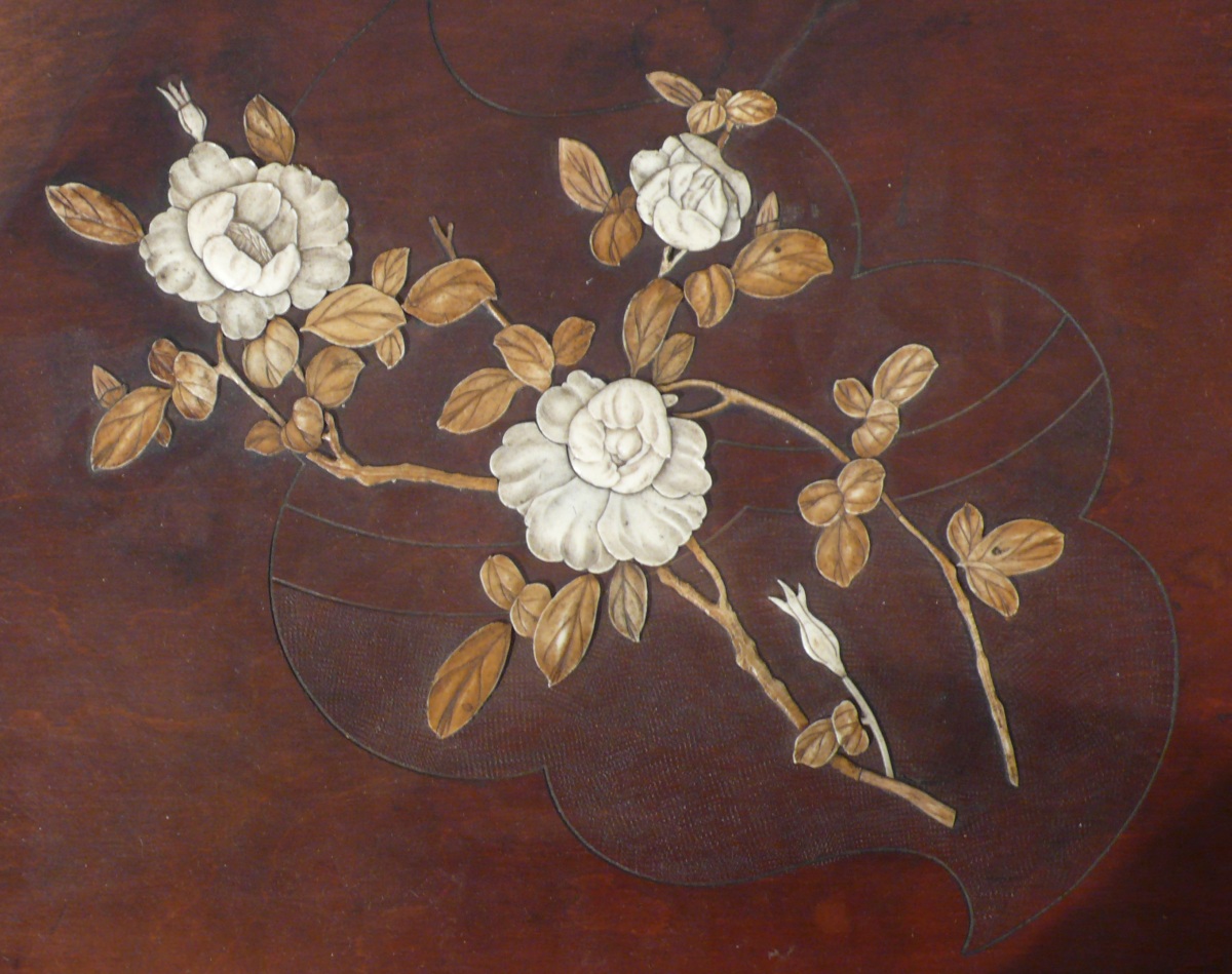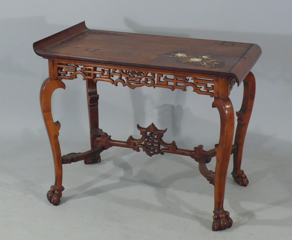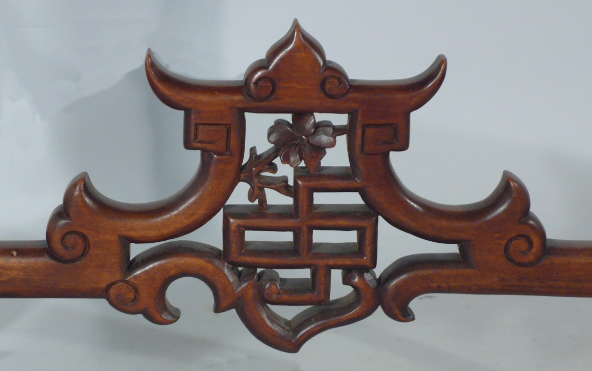 rectangulaire en bois exotique sculpté et ajouré. Le plateau, à bords incurvés et à décor en incrustations d'os teinté de branchages fleuris. La ceinture ajourée de volutes et croisillons. Repose sur des pieds cambrés terminés par des griffes et réunis par une entretoise en H à décor de nuées et centrée d'un idéogramme ajouré.