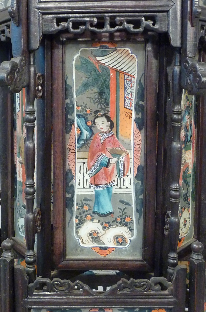 dix-huit fixés sous verre opaque peints de personnages chinois dans un décor architecturé. Ornée de six pendants tombant des angles, en perles de verre et plaques de cuivre émaillées à motif de fleurs.