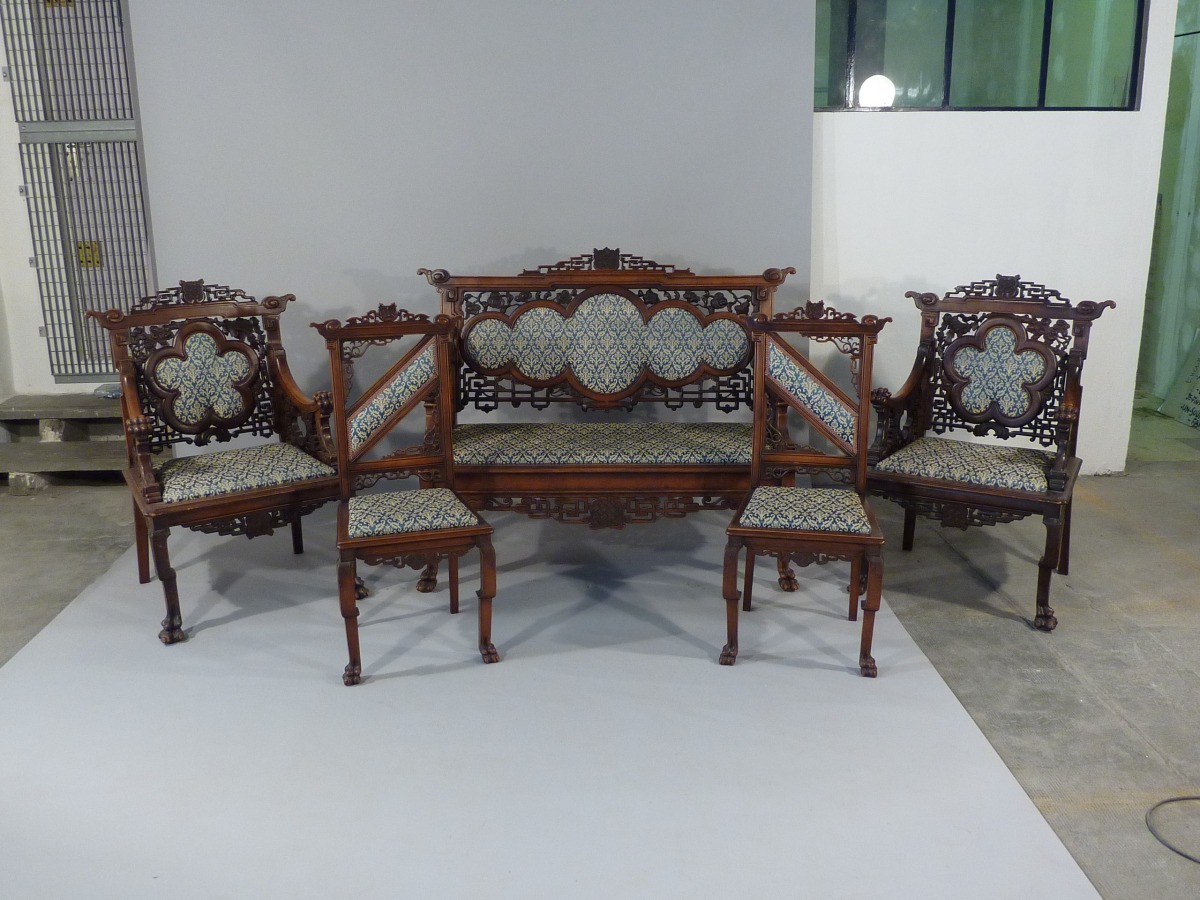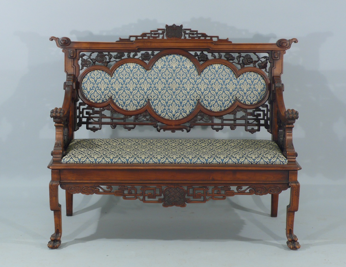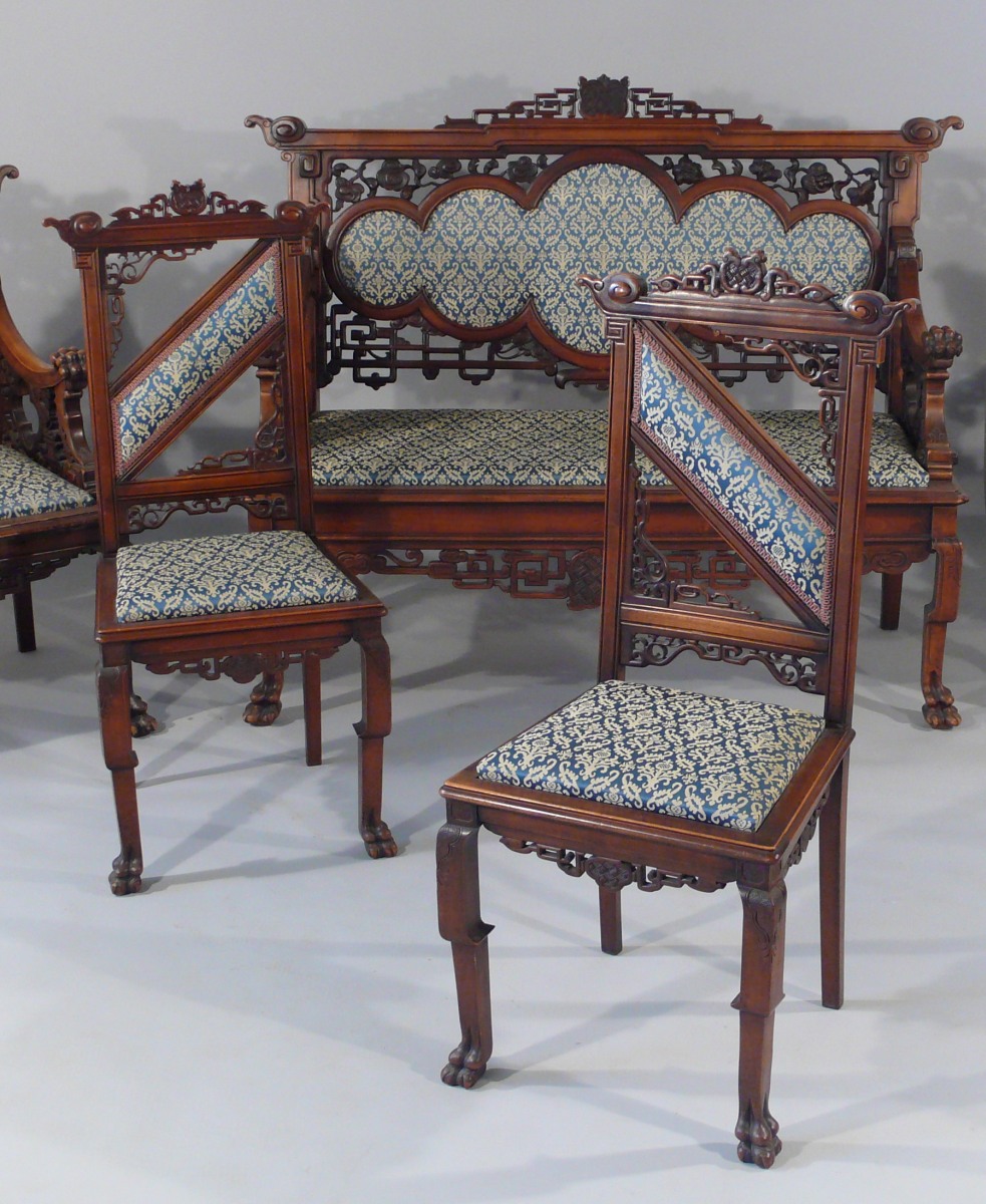 comprenant une PAIRE de CHAISES, une PAIRE de FAUTEUILS et un CANAPÉ en bois exotique sculpté et ajouré. Les dossiers à décor de volutes de nuées aux extrémités. Les traverses supérieures et inférieures à décor de volutes et entrelacs centré d'un cartouche à l'imitation de treillage. Les dossiers à décor ajouré d'enroulements, nuées et feuillages stylisés et centrés d'un nuage pour le canapé, d'une quintefeuille pour les fauteuils et d'une bande diagonale pour les chaises. Reposent sur des pieds cambrés. Garniture de soie bleue amovible.