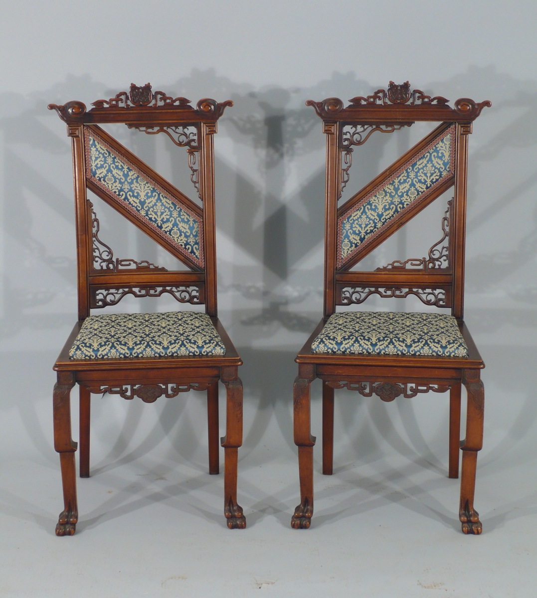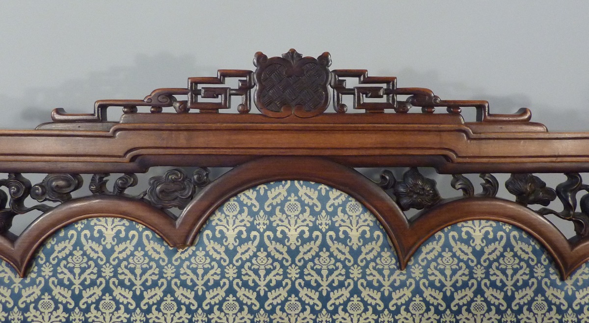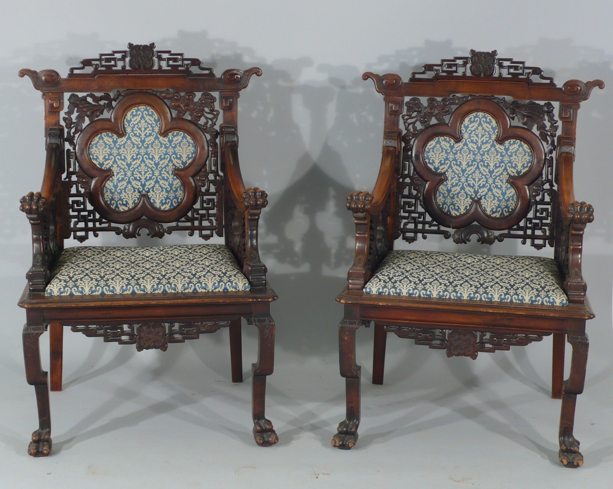 comprenant une PAIRE de CHAISES, une PAIRE de FAUTEUILS et un CANAPÉ en bois exotique sculpté et ajouré. Les dossiers à décor de volutes de nuées aux extrémités. Les traverses supérieures et inférieures à décor de volutes et entrelacs centré d'un cartouche à l'imitation de treillage. Les dossiers à décor ajouré d'enroulements, nuées et feuillages stylisés et centrés d'un nuage pour le canapé, d'une quintefeuille pour les fauteuils et d'une bande diagonale pour les chaises. Reposent sur des pieds cambrés. Garniture de soie bleue amovible.