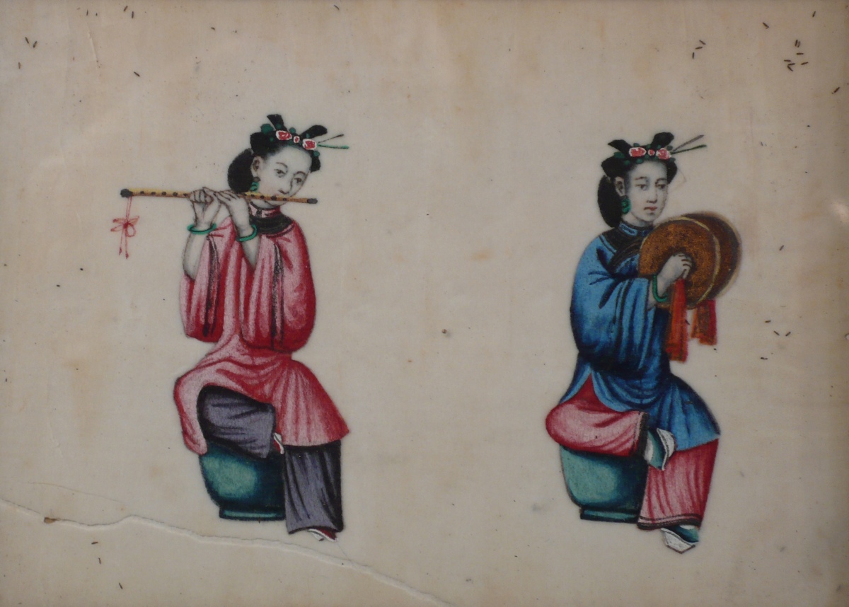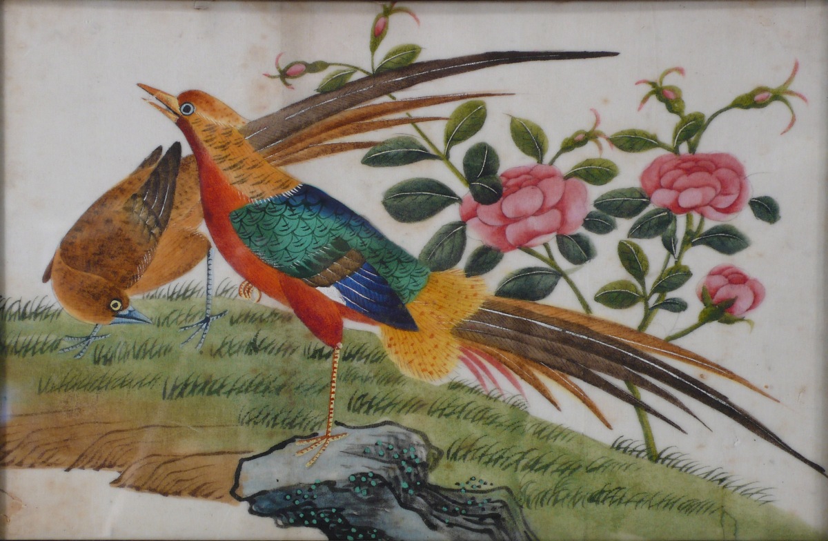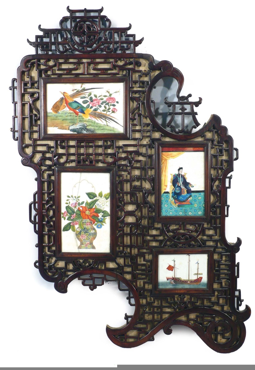 sur soie représentant des couples d'oiseaux, des personnages en habit de cour, un vase fleuri et une jonque. Dans cinq encadrements, dont trois en forme de nuées, en bois exotique sculpté et ajouré à décor de volutes et entrelacs.