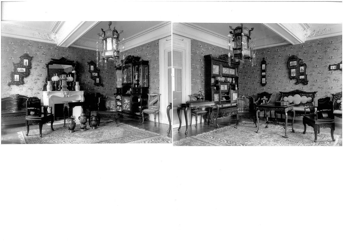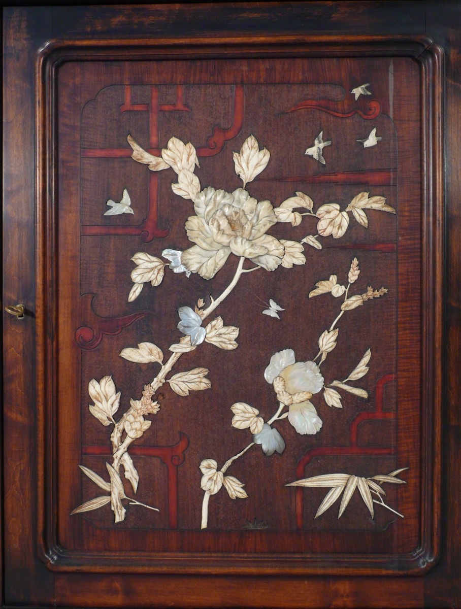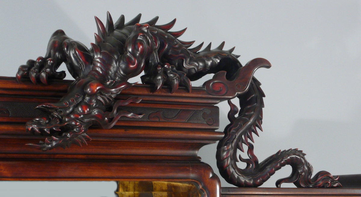 Oeuvre à rapprocher du travail de Gabriel VIARDOT et notamment d'une petite vitrine conservée dans les collections du Musée d'Orsay et d'une armoire au dragon à incrustations de nacre conservée au Musée des Arts Décoratifs. Ébéniste parisien du faubourg Saint-Antoine, Gabriel VIARDOT (1830-1906) produisait des meubles librement interprétés du mobilier extrême-oriental et adaptés au goût européen.