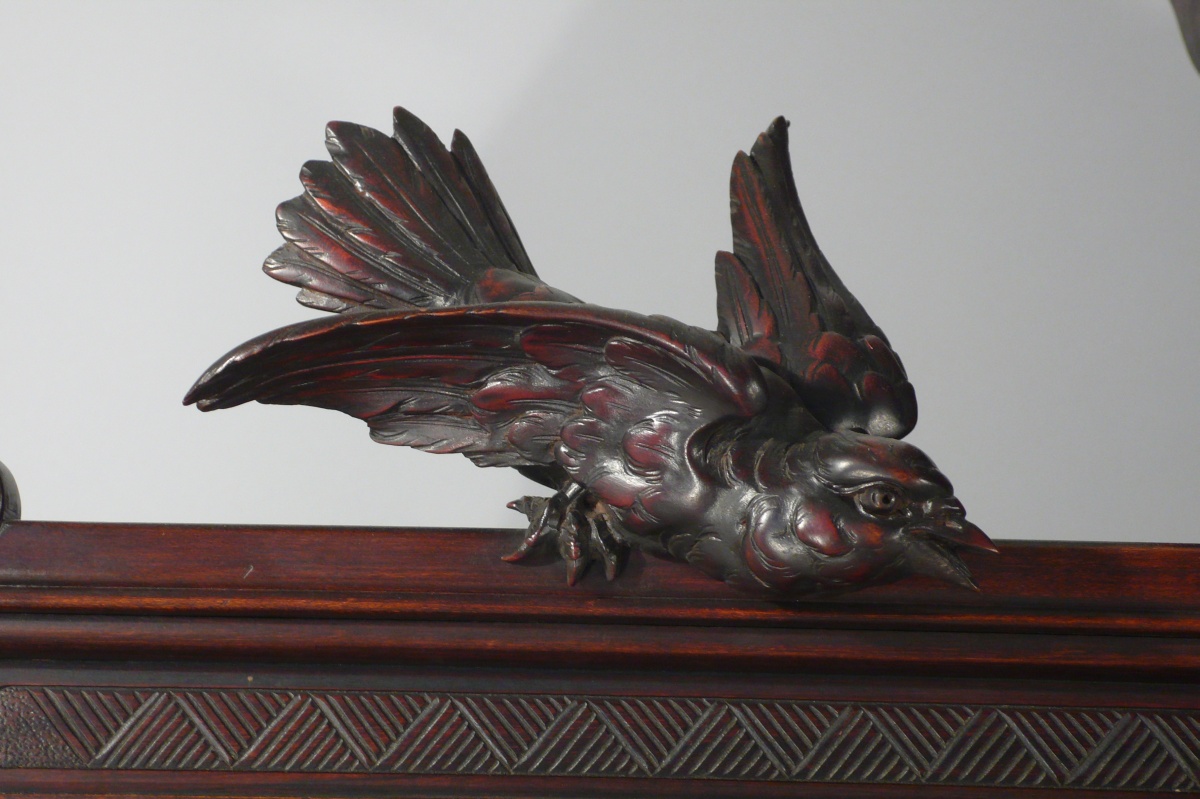 en bois exotique mouluré, sculpté et partiellement patiné rouge. La partie supérieure, foncée de glaces