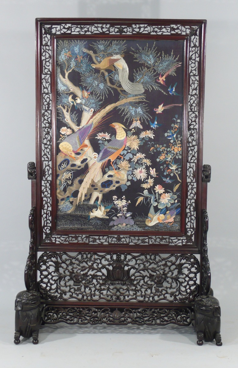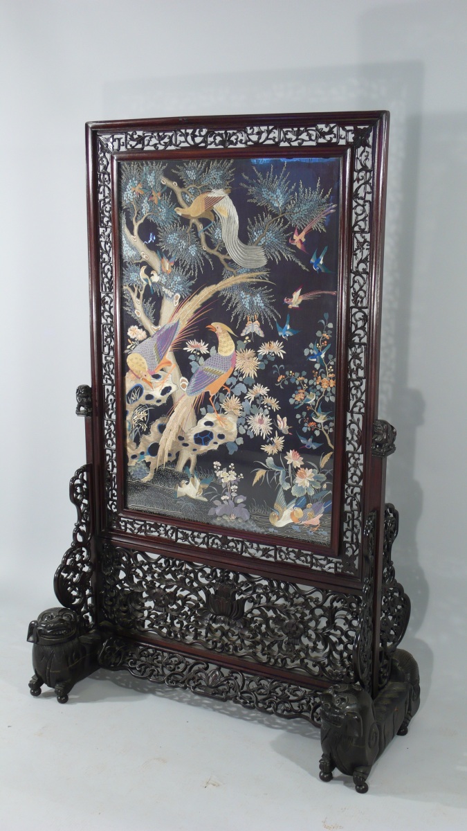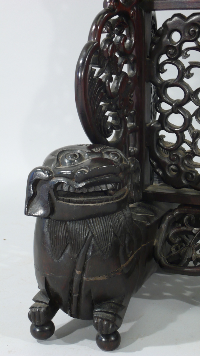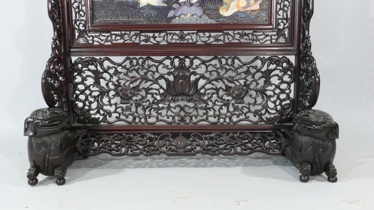 fleuri dont fleur de lotus et anémones. Le cadre à décor ajouré de branchages et flanqué de petits chiens de Fô. Il repose sur un piétement à décor ajouré de volutes et centré d'une fleur de lotus. Les pieds figurent des chiens de Fô surmontés de nuées et posés sur des boules.