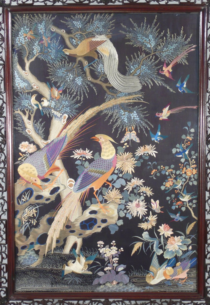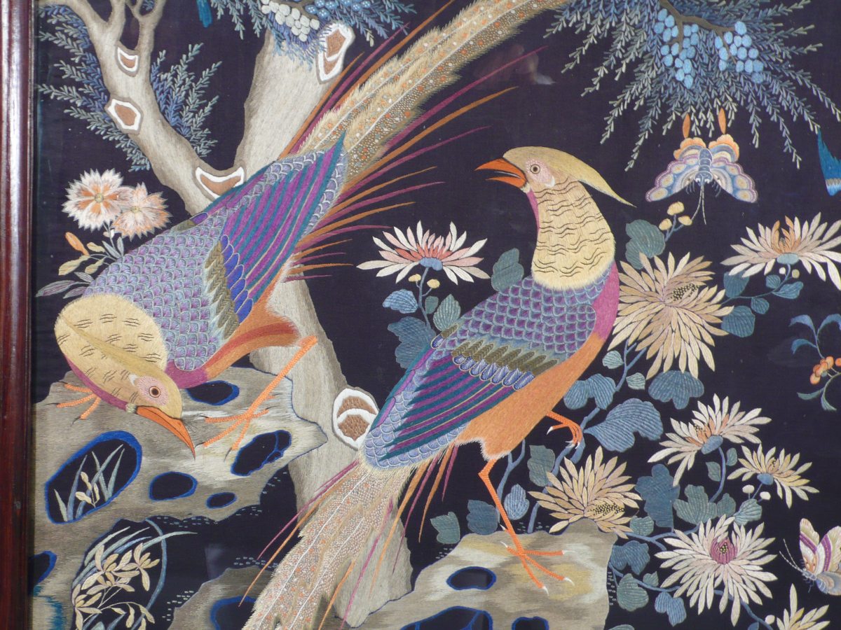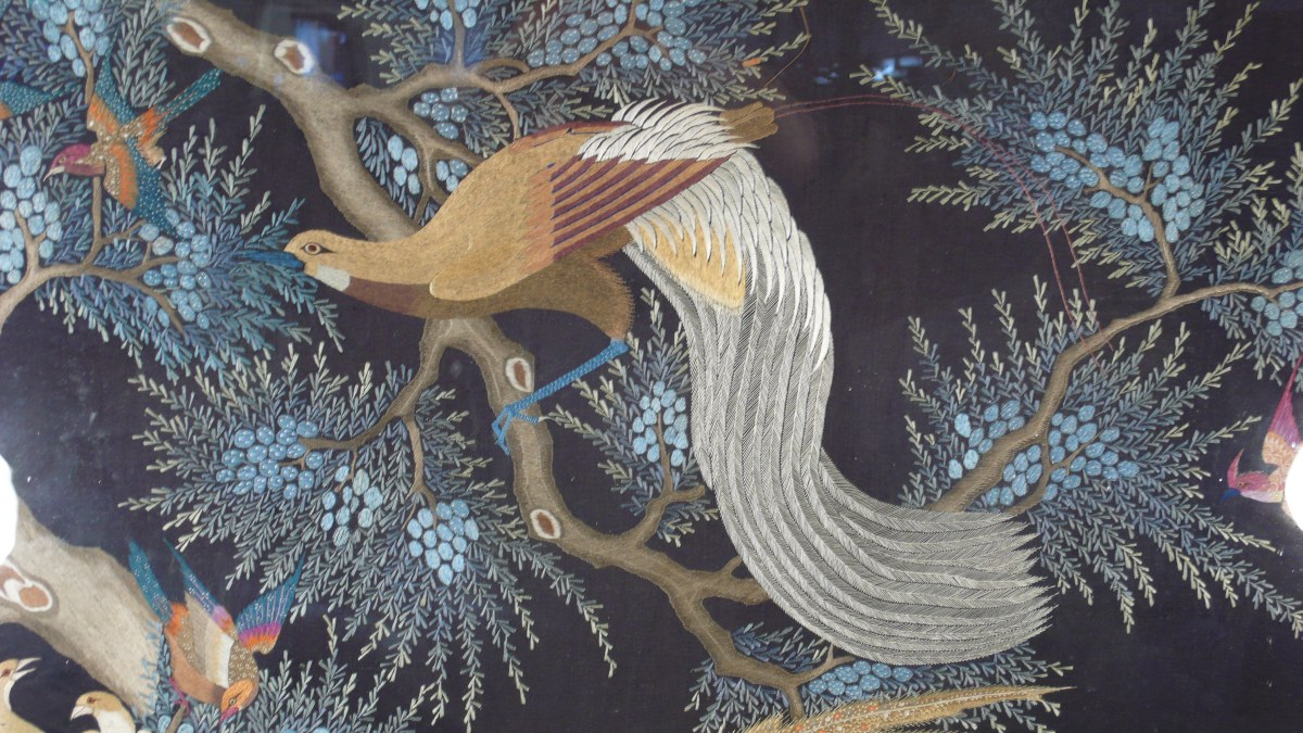 fond noir représentant des oiseaux dont oiseau de feu et faisans dans des branchages et sur un parterre