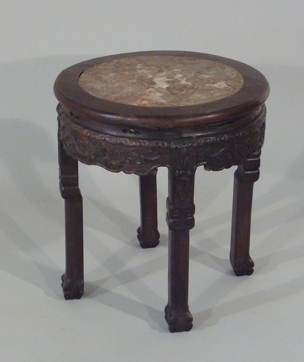 circulaire en bois exotique sculpté. Le plateau à marbre rose encastré et la frise à décor de fleurs de lotus
