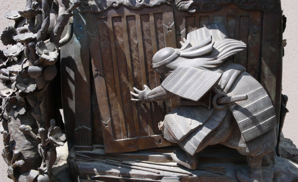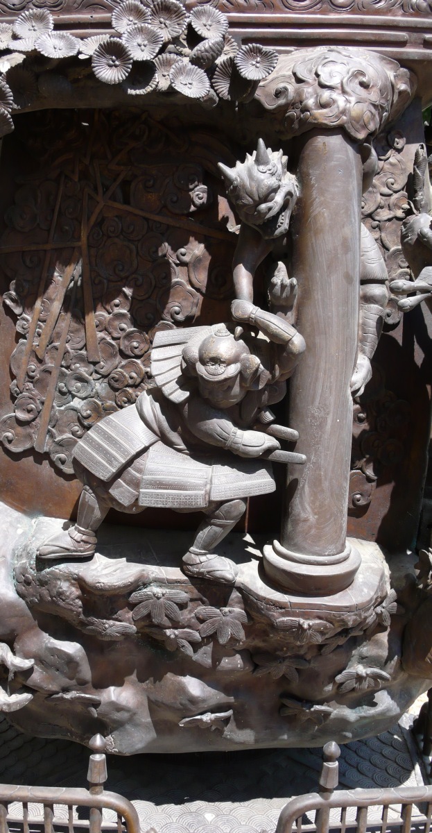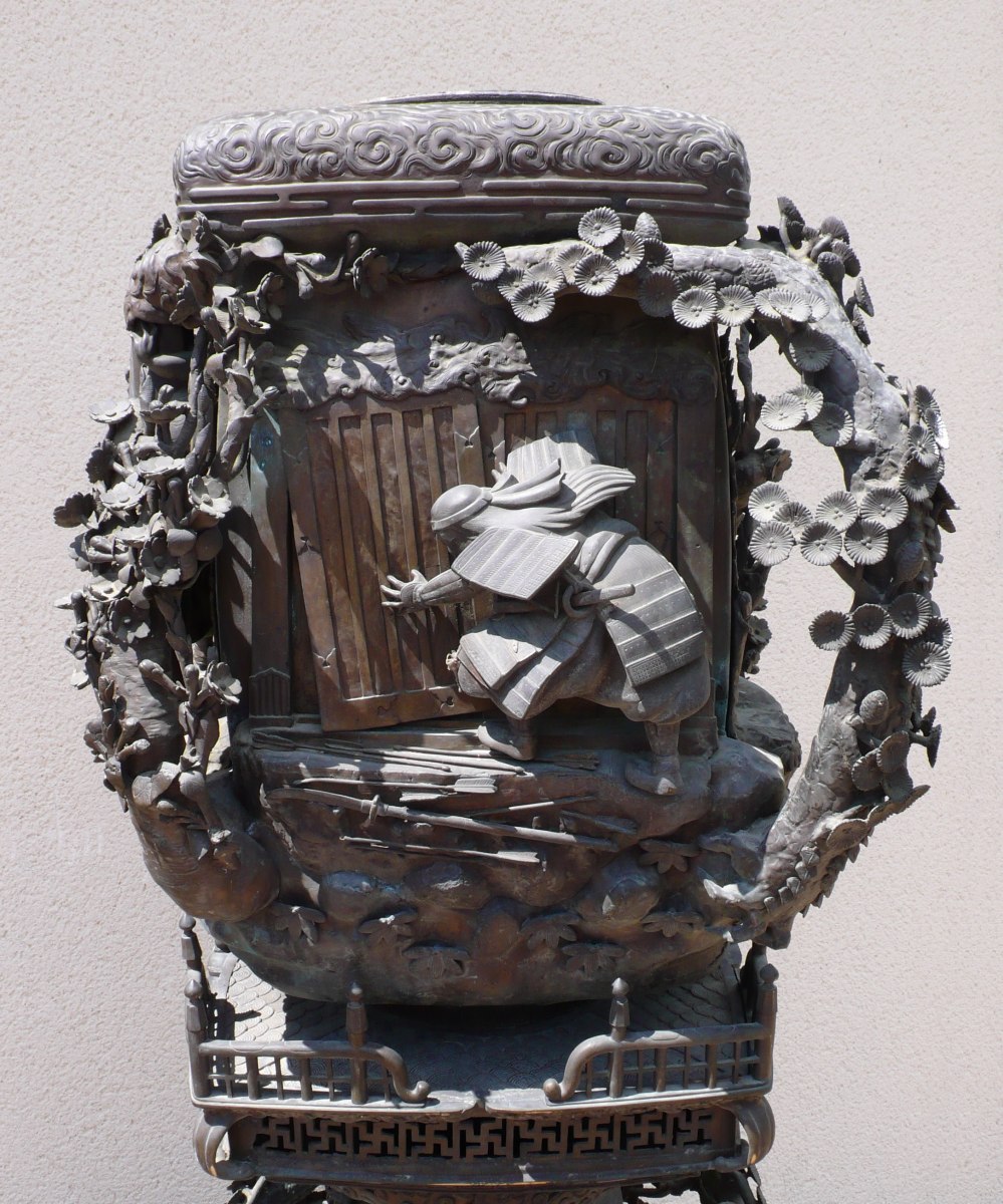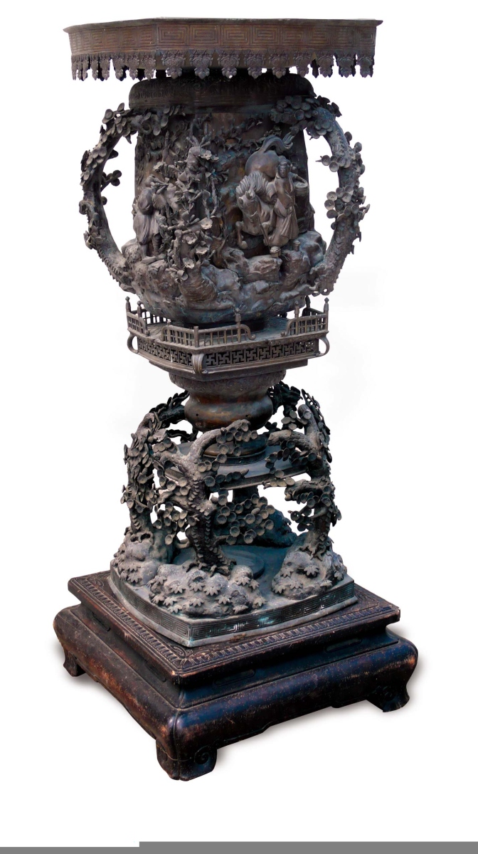en bronze à patine brune à décor en relief et détaché de la légende de Watanabe no Tsuna tuant le démon Ibaraki à la porte de Rashômon, sur chacun des faces séparées par des arbres fleuris une scène de personnages. Le pied est formé en relief par quatre pins enlacés. Il repose sur un socle carré à décor de vagues.