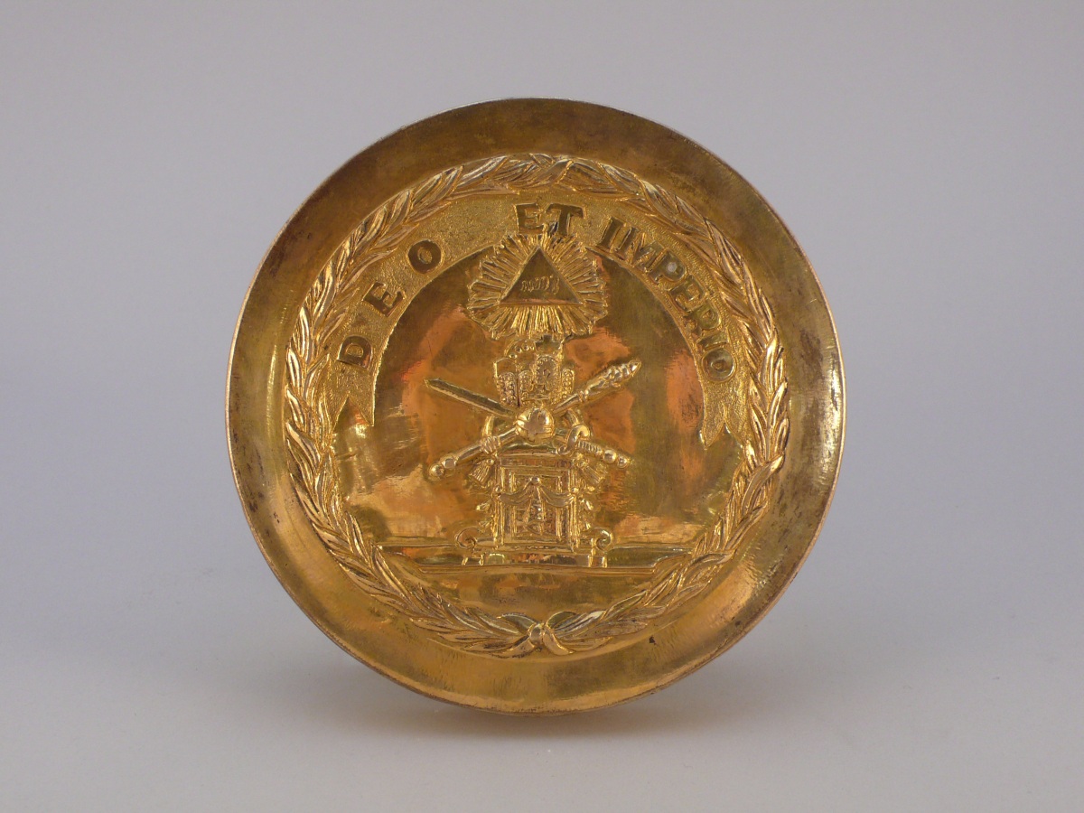 Revers: Légende ; DEO ET IMPERIO (pour Dieu et l’Empire). Sur un autel les insignes impériaux posés sur un coussin: épée, sceptre et couronne impériale, au dessus le nom de Dieu (Yahvé) dans un triangle rayonnant. Le tout dans une couronne de feuillage.