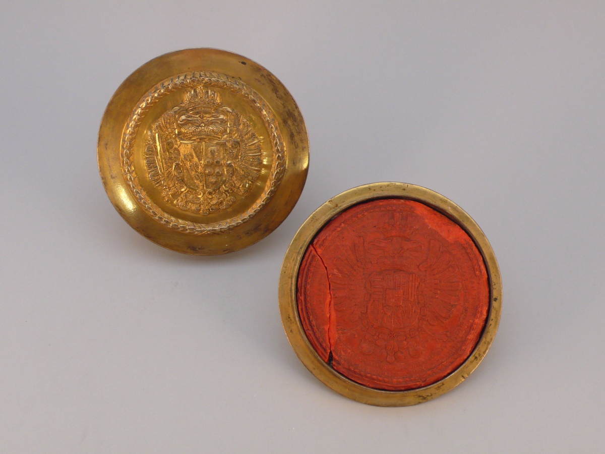 SCEAU en cire de l’empereur François Ier (1745-1765), époux de l’impératrice Marie-Thérèse (1740-1780), dans un étui protecteur en bronze doré et ciselé.