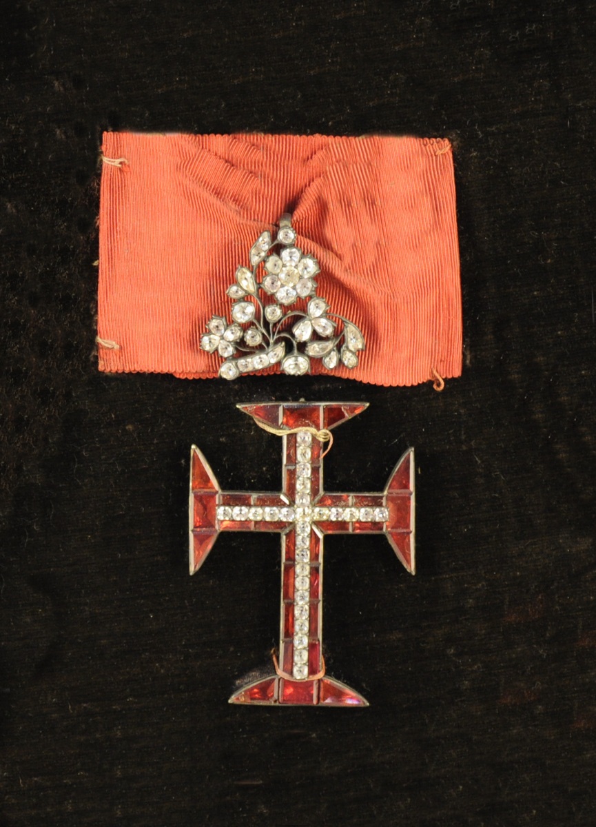 Portugal - Ordre militaire du Christ, fondé en 1319, bijou de grand-croix en vermeil, verre coloré (petits éclats) et strass, surmonté d'un élégant motif floral d'inspiration baroque serti de strass (dessoudé).