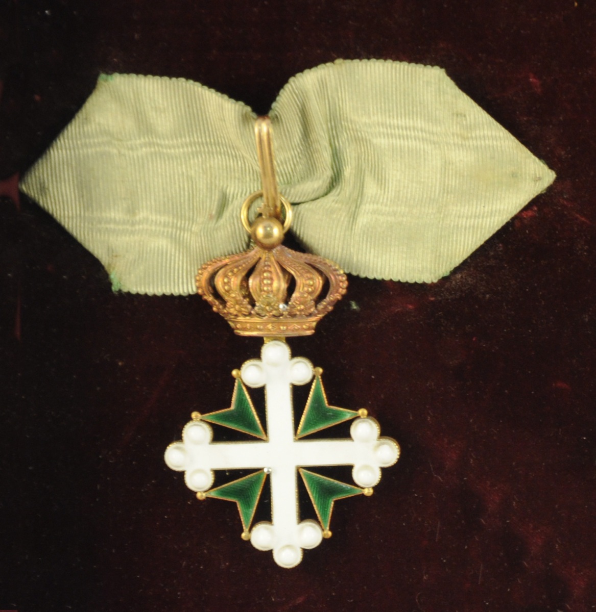 Italie - Ordre de Saint-Maurice et Saint-Lazare, fondé en 1572, croix de commandeur, en or et émail, fragment de cravate insolée, dans son écrin de la maison Cravanzola, en velours vert au monogramme de Victor Emmanuel III.