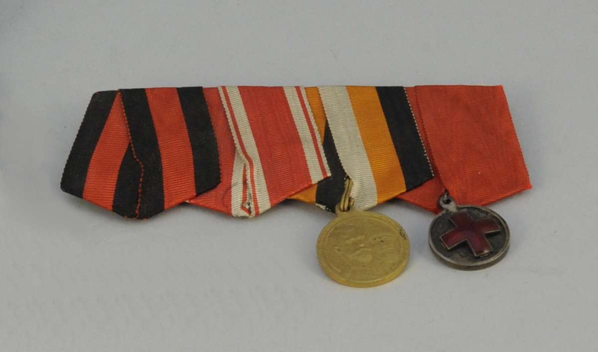 Russie - Barrette de quatre rubans pour uniforme monté à la Russe: ordre de Saint-Vladimir, sans la croix ; ordre de Saint-Stanislas, sans la croix ; médaille du Tricentenaire des Romanov, en bronze doré, diam. 28 mm ; médaille de La Croix-Rouge pour la guerre Russo-Japonaise 1904-1905, en argent et émail, poinçon 84, diam. 24 mm.