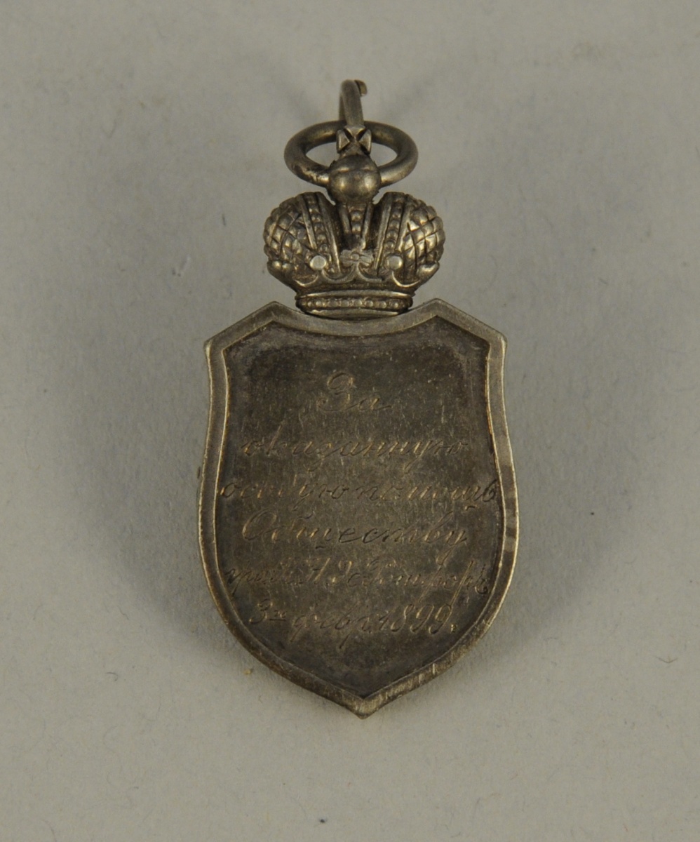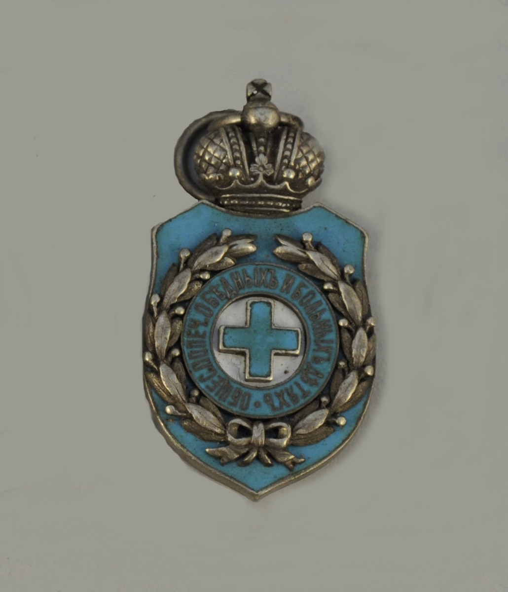 Russie - Jeton de la Société de soins pour les enfants pauvres et malades, en argent et émail, au centre une croix émaillée bleue, au revers l'attribution gravée en cyrillique Pour avoir porté secours de façon remarquable K.N. de Rochefort 3 février 1899, surmonté d'une couronne.