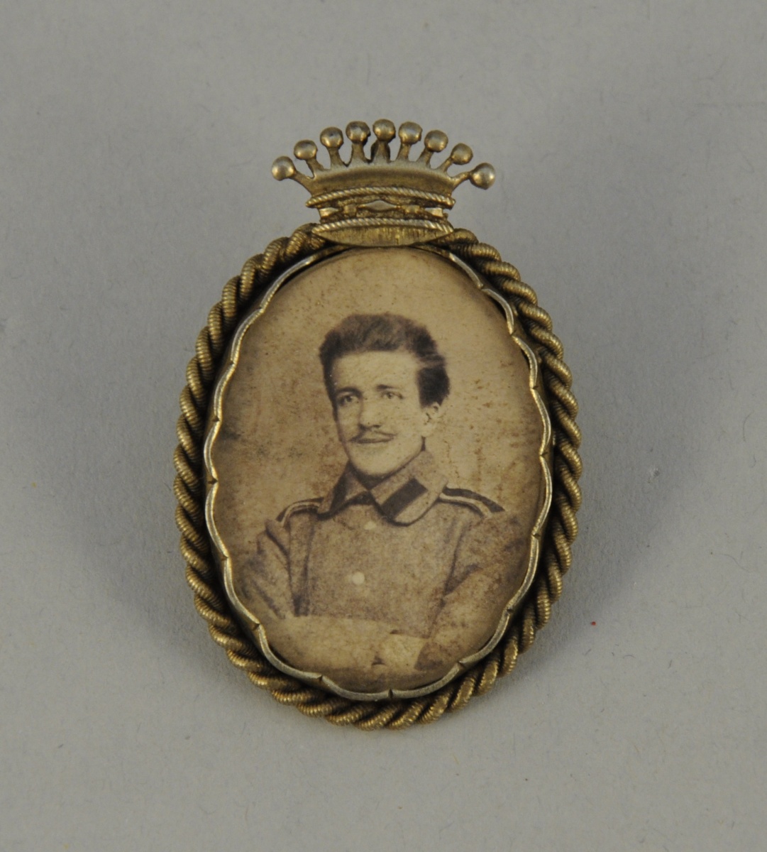 Russie - Médaillon pendentif en vermeil de forme ovale, surmonté d'une couronne comtale, enchâssant la photo sous verre d'un élève officier en manteau, gravé au revers de la légende en cyrillique 26 avril 1896, poinçon 84 de Saint-Pétersbourg et d'orfèvre illisible.