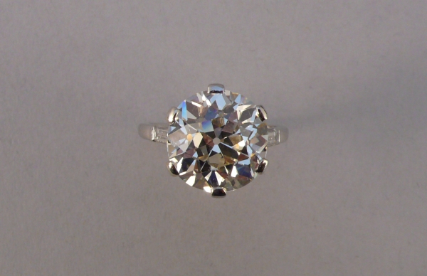 BAGUE sertie d'un diamant solitaire d'environ 7,62 carats, de forme ronde et de taille ancienne, entre deux diamants baguettes, la monture en platine.).