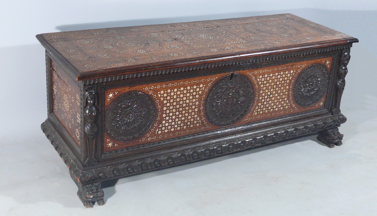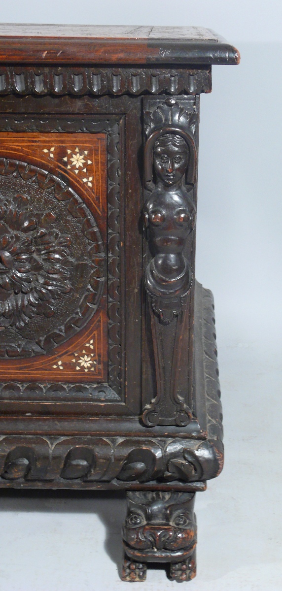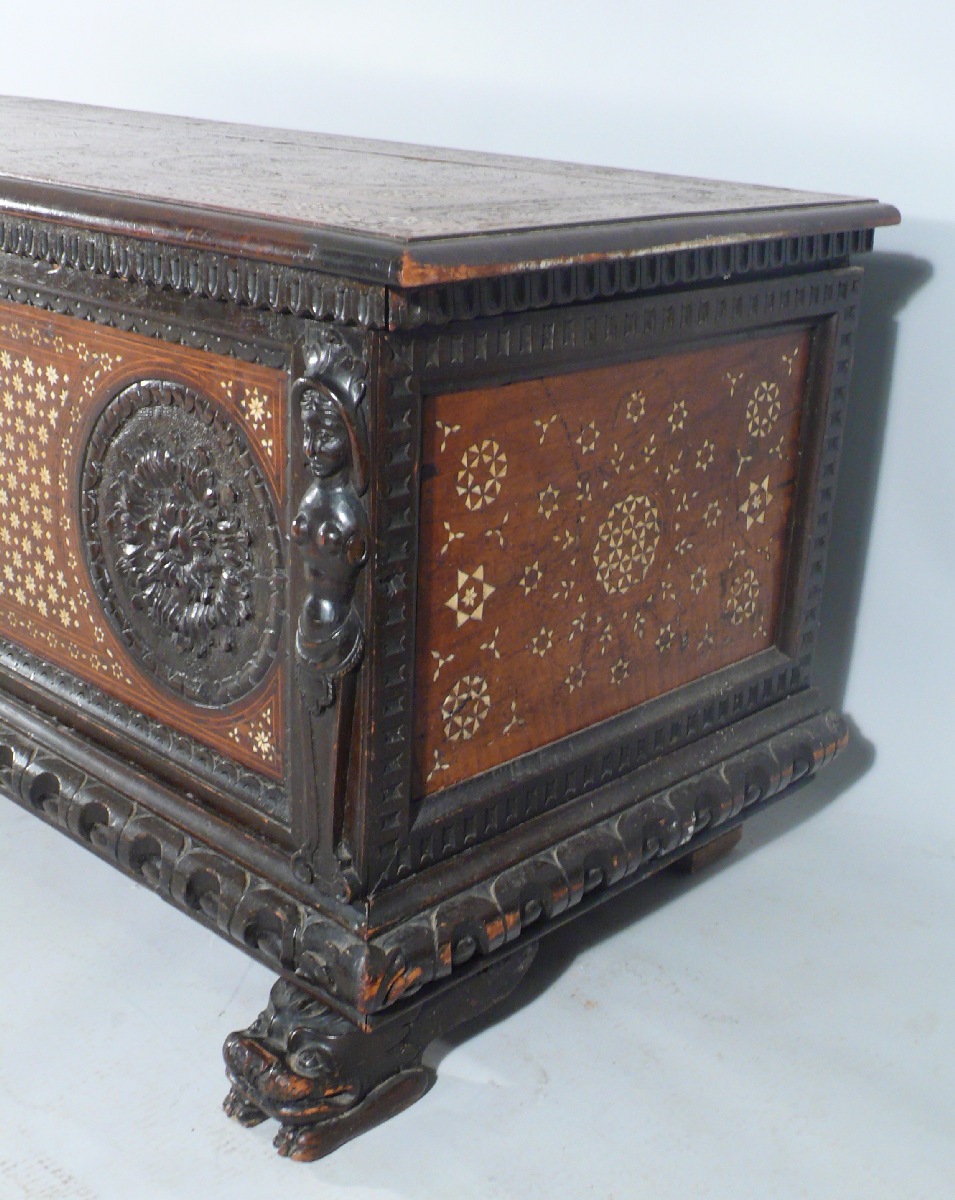 COFFRE en bois noirci et sculpté, incrustations d'os et filets de bois clair. Les montant antérieurs figurent des termes féminins coiffés et sommés d'une feuille d'acanthe. La façade ornée de trois macarons en rosace à décor d'acanthes stylisées. Le macaron central décoré d'un cuir à enroulement formant cartouche et bordé de feuilles d'eau. La façade, le plateau et les flancs à décor géométrisant d'un semis d'étoiles à six ou huit branches en os sur fond clair. La traverse inférieure godronnée repose sur des pieds patins à décor de lions stylisés.
