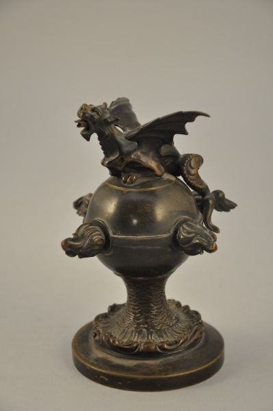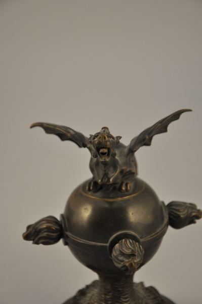 SUJET en bronze à patine médaille représentant une dragon sur un orbe flammé.