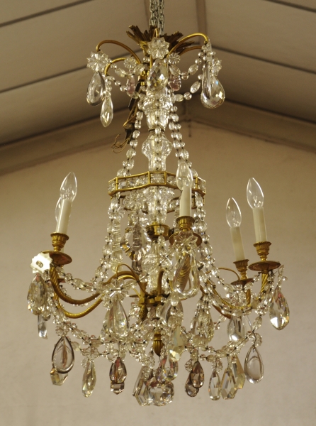 LUSTRE à pampilles et pendeloques en bronze doré à six bras de lumière à décor torsadé.