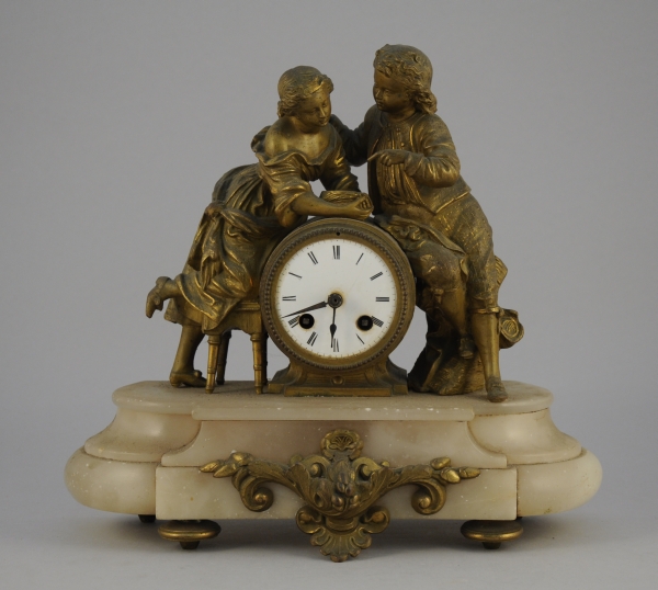 PENDULE en albâtre et bronze figurant de jeunes amoureux autour d'un nid, reposant sur quatre pieds toupies. Cadran émaillé orné de chiffres romains. Suspension métallique sans son timbre, en l'état. Mouvement signé "REY AINÉ & COMMUN à Paris".