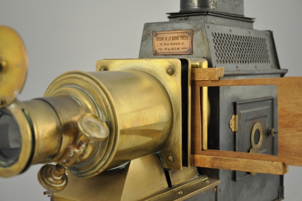 LANTERNE de PROJECTION en tôle et laiton, objectif à lentille règlable. Porte une plaque gravée "MAISON DE LA BONNE PRESSE. 5, rue Bayard, 5. PARIS". Porte-plaque en bois. Avec sa lampe électrique.