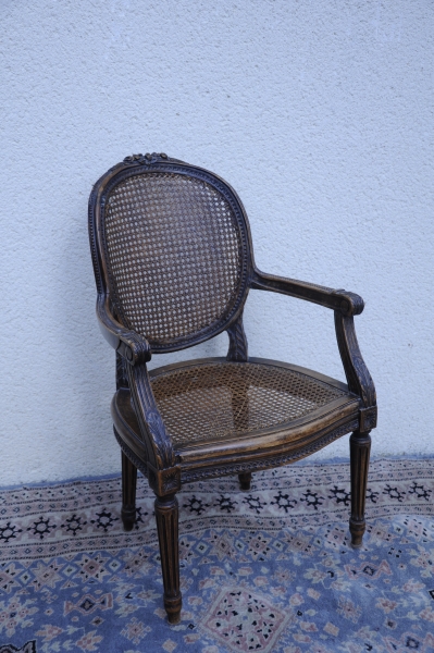 FAUTEUIL d' ENFANT canné en hêtre mouluré et sculpté à décor de rangs de perles, acanthes et ruban, le dossier incurvé à médaillon. Repose sur des pieds cannelés fuselés.