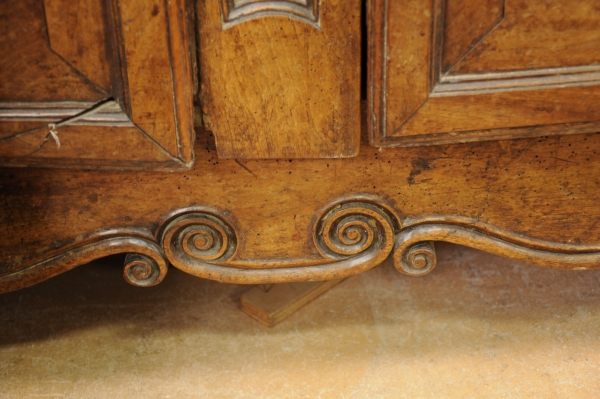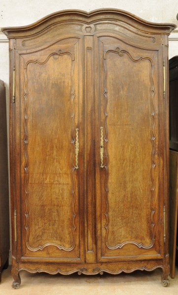 ARMOIRE en bois naturel mouluré et sculpté, à décor mouvementé, la corniche de forme arbalète, reposant sur des pieds antérieurs cambrés à enroulements.