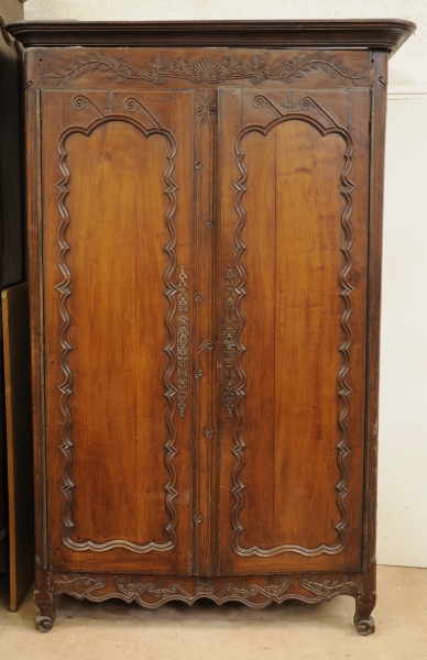 ARMOIRE en bois naturel mouluré et sculpté. Décor de volutes, palmettes et feuillages stylisés, la traverse inférieure chantournée. Les pieds antérieurs cambrés à enroulements.