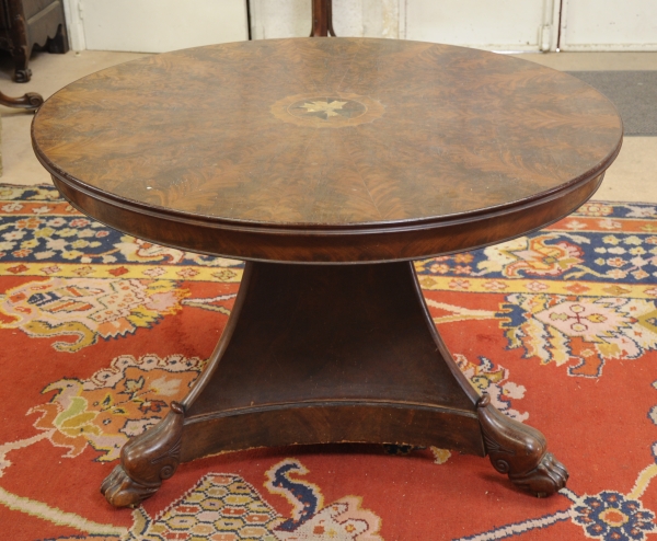 GUÉRIDON circulaire en placage d'acajou. Le plateau marqueté en ronces rayonnantes autour d'une croix de Malte dans un double médaillon. Piètement tripode terminé par des griffes ailées aux fleurs de lotus, roulettes.
