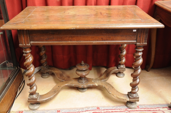 TABLE à écrire en noyer mouluré ouvrant à un tiroir en ceinture, reposant sur quatre pieds torsadés terminé par des boules applaties et réunis par une entretoise en "X" surmontée d'une toupie sur pied.