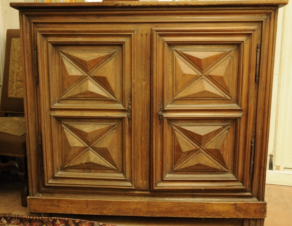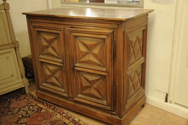 BUFFET à hauteur d'appui en bois naturel mouluré et sculpté ouvrant à deux vantaux à décor de pointes de diamant, reposant sur quatre petits pieds droits.