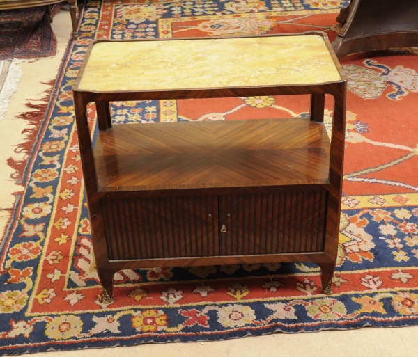 DESSERTE en placage de bois de rose et ornementations de bronze ciselé, la partie supérieure ajourée à plateau de marbre jaune intégré, la partie inférieure ouvrant par un rideau flanquée de poignées à décor mouvementé, repose sur des pieds légèrement cambrés à sabots.