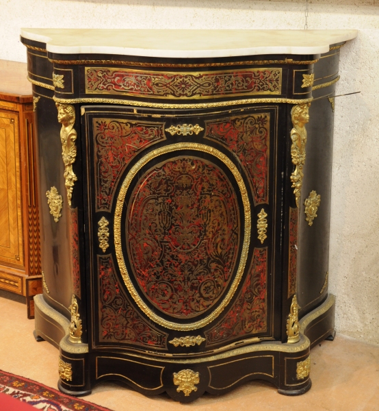 MEUBLE d'ENTRE-DEUX en bois noirci, marqueterie "Boulle" d'écaille teintée rouge et laiton, et ornementations de bronze ciselé, de forme galbée sur trois faces. Ouvrant par un vantail à riche décor de vase fleuri, rinceaux et entrelacs, les montants arrondis à décor de termes en gaine. Dessus de marbre blanc.