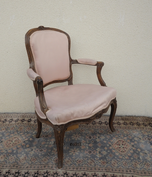 FAUTEUIL cabriolet en bois naturel mouluré et sculpté, le dossier cintré, reposant sur des pieds cambrés. Estampillé "...DECA... . JME".