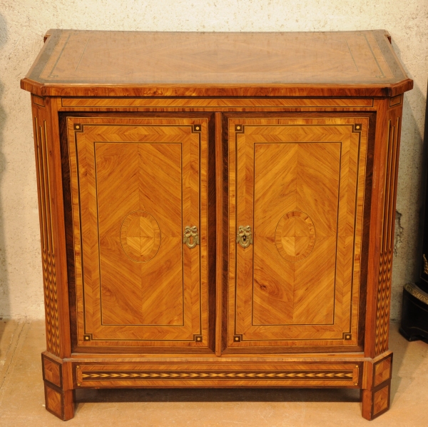MEUBLE d'ENTRE-DEUX en placage toutes faces de bois de rose, palissandre et acajou, filets de bois clair et foncé, ouvrant à deux vantaux. Les montants antérieurs à pans coupés et postérieurs à décor marqueté de cannelures à asperges simulées. Les vantaux à décor de médaillons dans des encadrements.