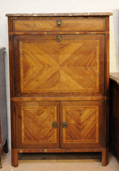 SECRÉTAIRE en bois de placage et filets de bois clair ouvrant par un tiroir, deux vantaux et un abattant découvrant quatre casiers et six tiroirs, les montants à pans coupés. Dessus de marbre rouge de Bourgogne.